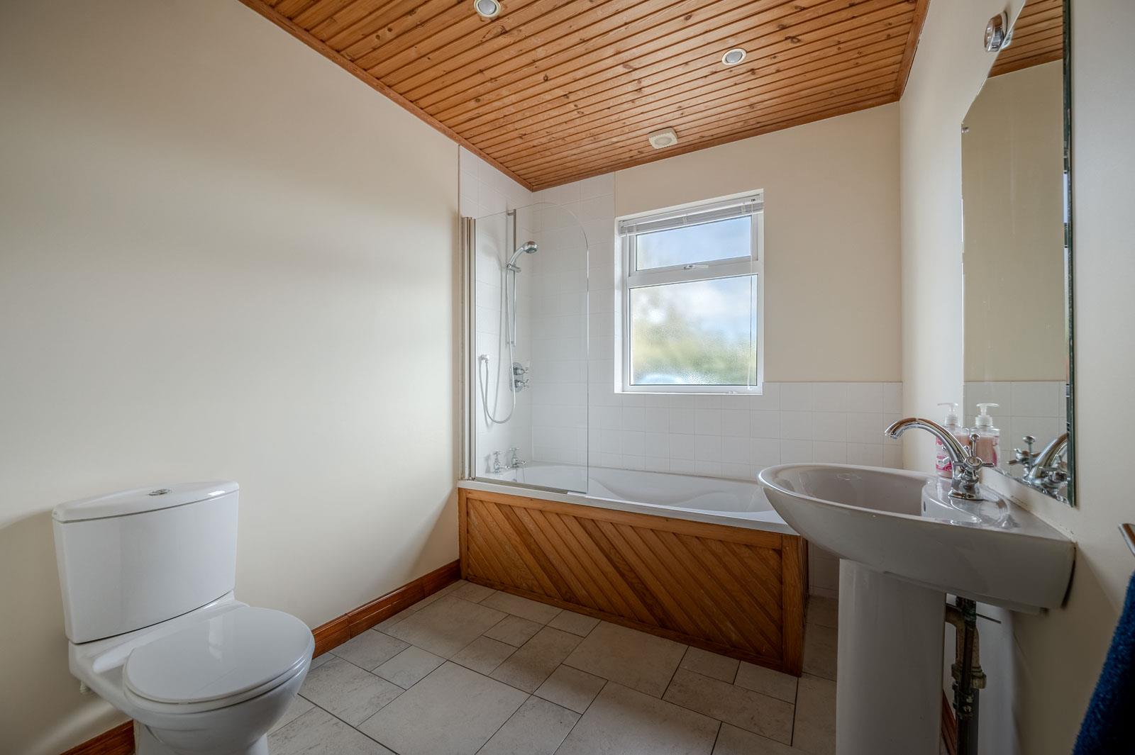 The bathroom is fitted with a contemporary white suite, including a low flush WC, wall-hung wash hand basin with chrome mixer taps, and a rectangular panelled bath with matching chrome fittings and shower. A feature tiled splashback, ceramic tiled floor, and tongue and groove ceiling add style and durability.
