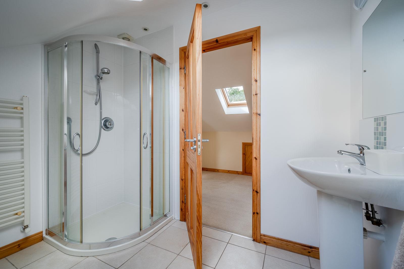 White suite comprising: wash hand basin with chrome mixer tap, feature tiled splash back, low flush WC, fully tiled shower cubicle with thermostatically controlled power shower unit and ceramic tiled floor.