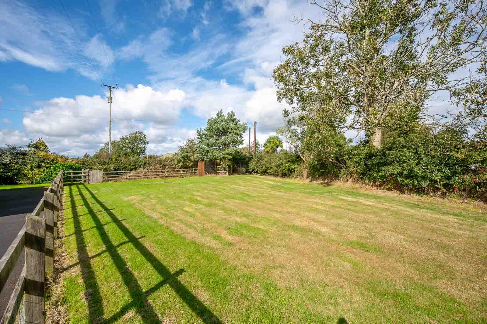 Externally, the home sits amidst beautifully maintained gardens to the front, side and rear, with colourful flowers, mature trees and a private paddock offering exceptional outdoor space. A detached double garage and expansive tarmac driveway provide generous parking for multiple vehicles, caravans or boats. The double garage also boosts additional shelving and loft storage.
