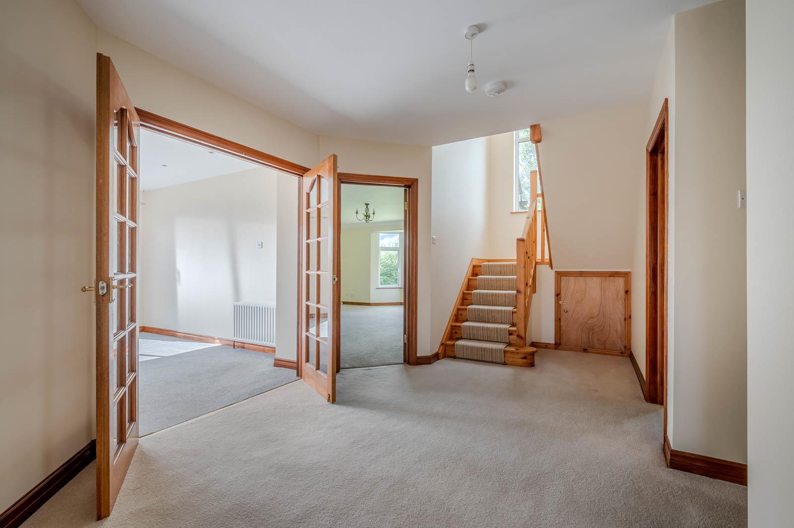 A bright and spacious entrance hall welcomes you with natural light and a warm, airy feel. Featuring elegant glass-panelled double doors, neutral décor and a central staircase, this inviting space offers an immediate sense of openness and flow throughout the home.