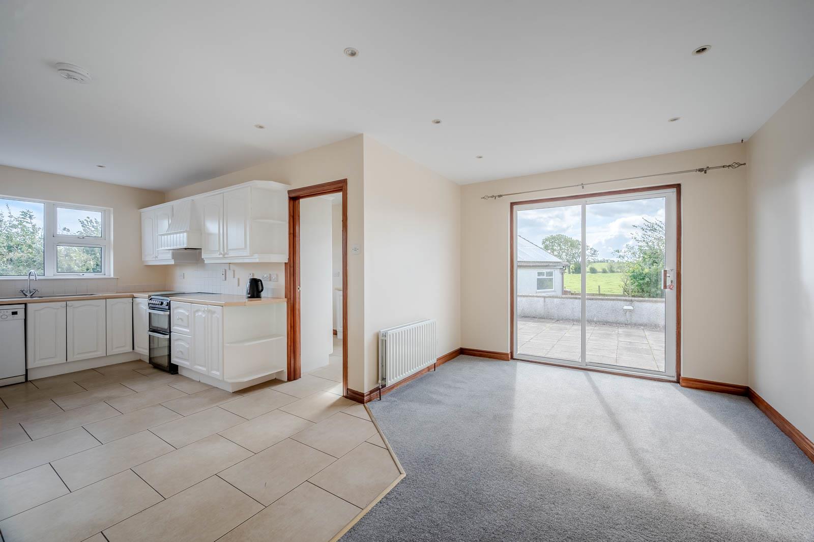 The dining area features a spotless grey carpet with large sliding doors out to the paved terrace.