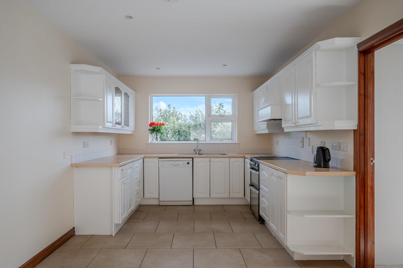 The kitchen is bright and spacious, featuring classic white cabinetry with plenty of storage space and light wood countertops. The U-shaped layout includes a dishwasher, electric oven with hob, and a stainless steel sink positioned under a large window that fills the room with natural light. Neutral tiled flooring and cream-painted walls create a clean and timeless look.