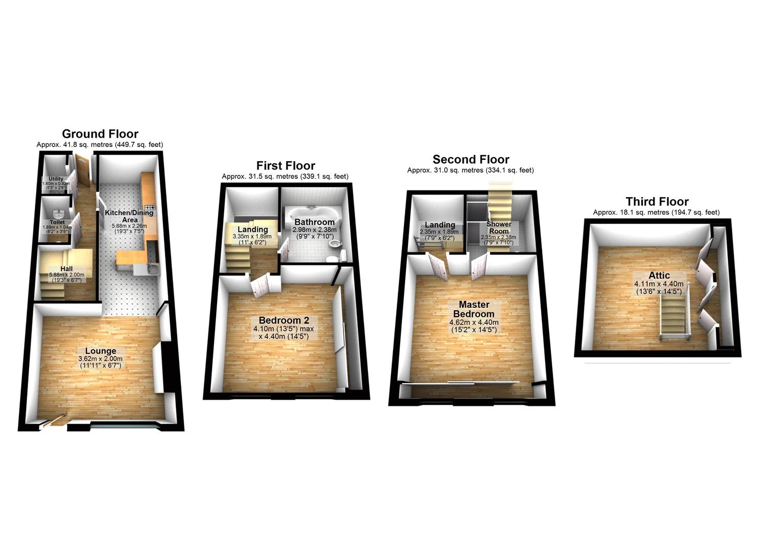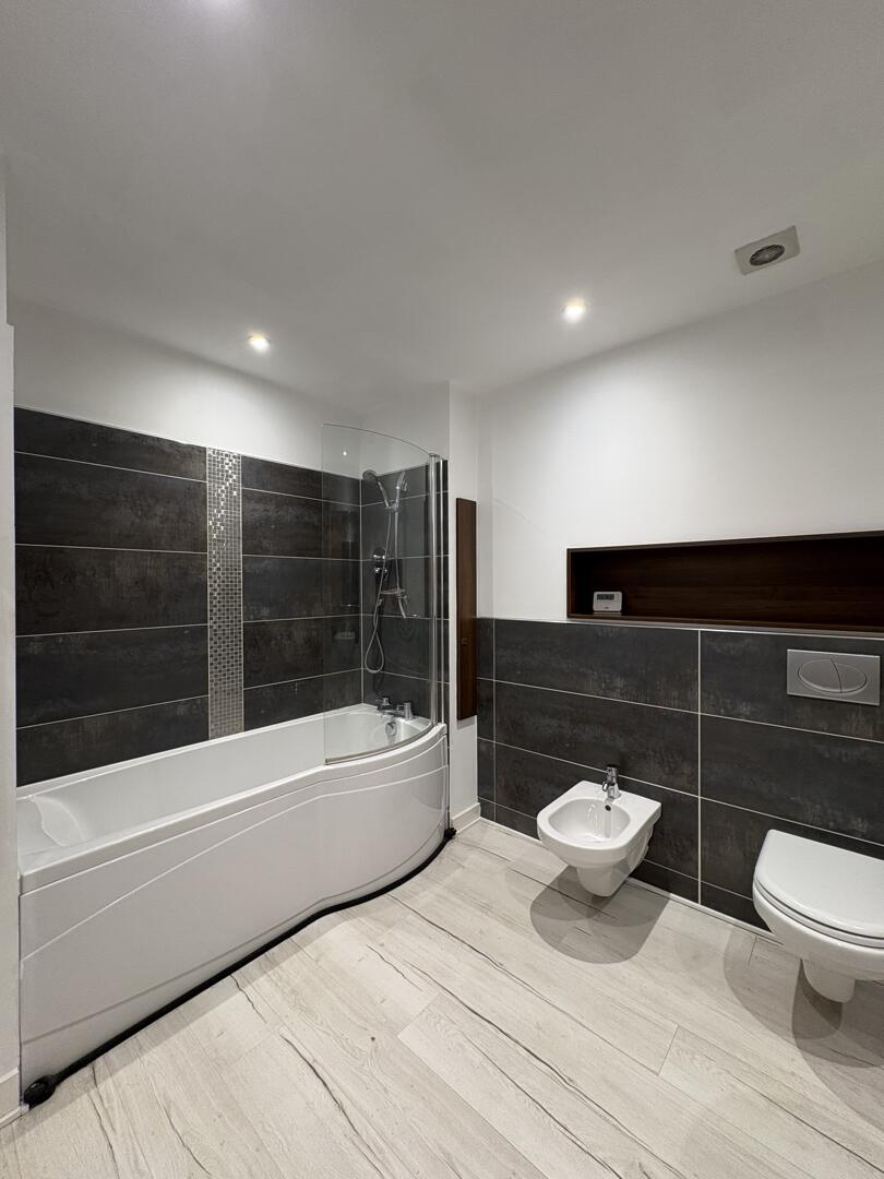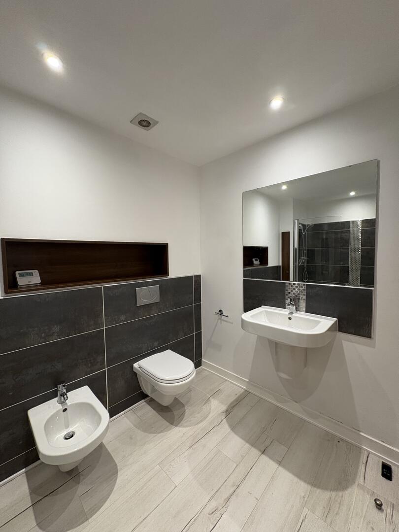 Laminate wood flooring, part tiled walls, recessed spot lights, bath with curved glass shower screen, thermostatically controlled shower and chrome tap, Chrome heated towel rail, inset shelf, bidet, close coupled WC, ½ pedestal sink with chrome mixer tap, tiled splashback, extractor fan
