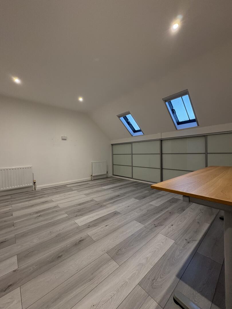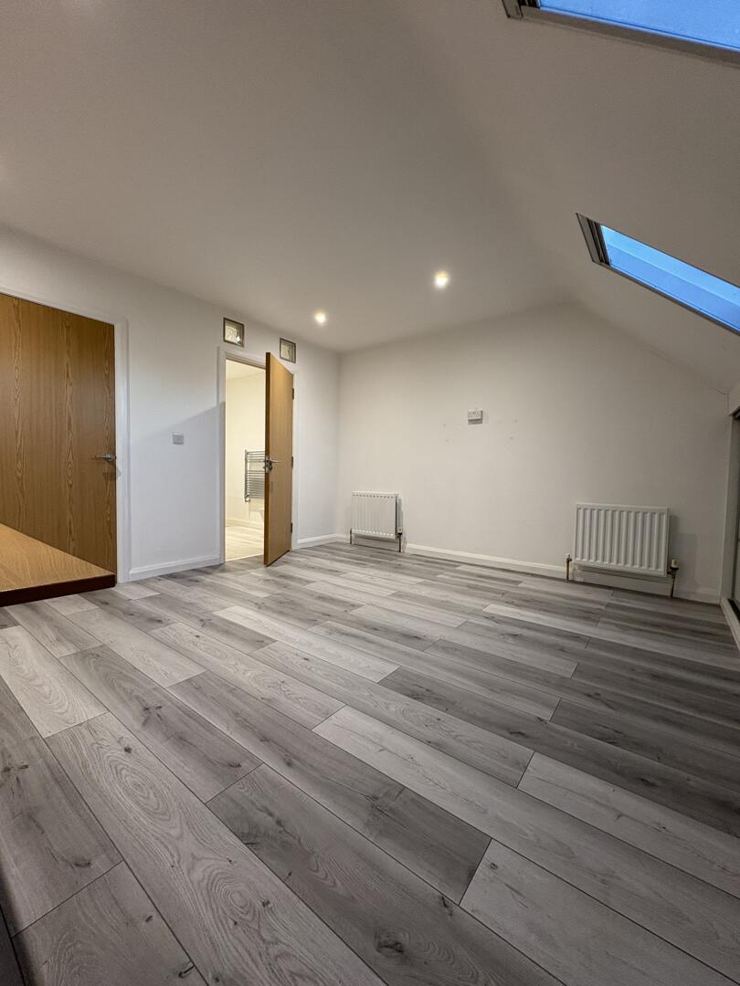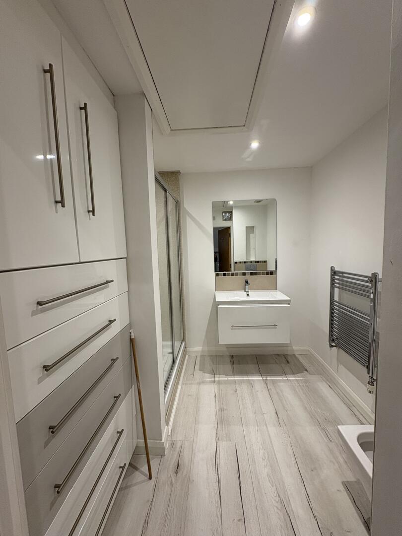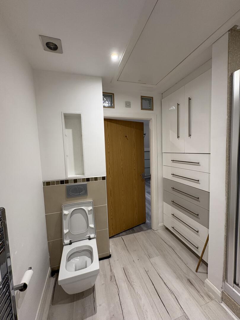 Laminate wood flooring, recessed spotlights, extensive range of built in storage - drawers and cupboards, double shower enclosure with thermostatically controlled shower, floating vanity unit with sink and chrome mixer tap, tiled splashback, close coupled WC, extractor fan, access to roof space