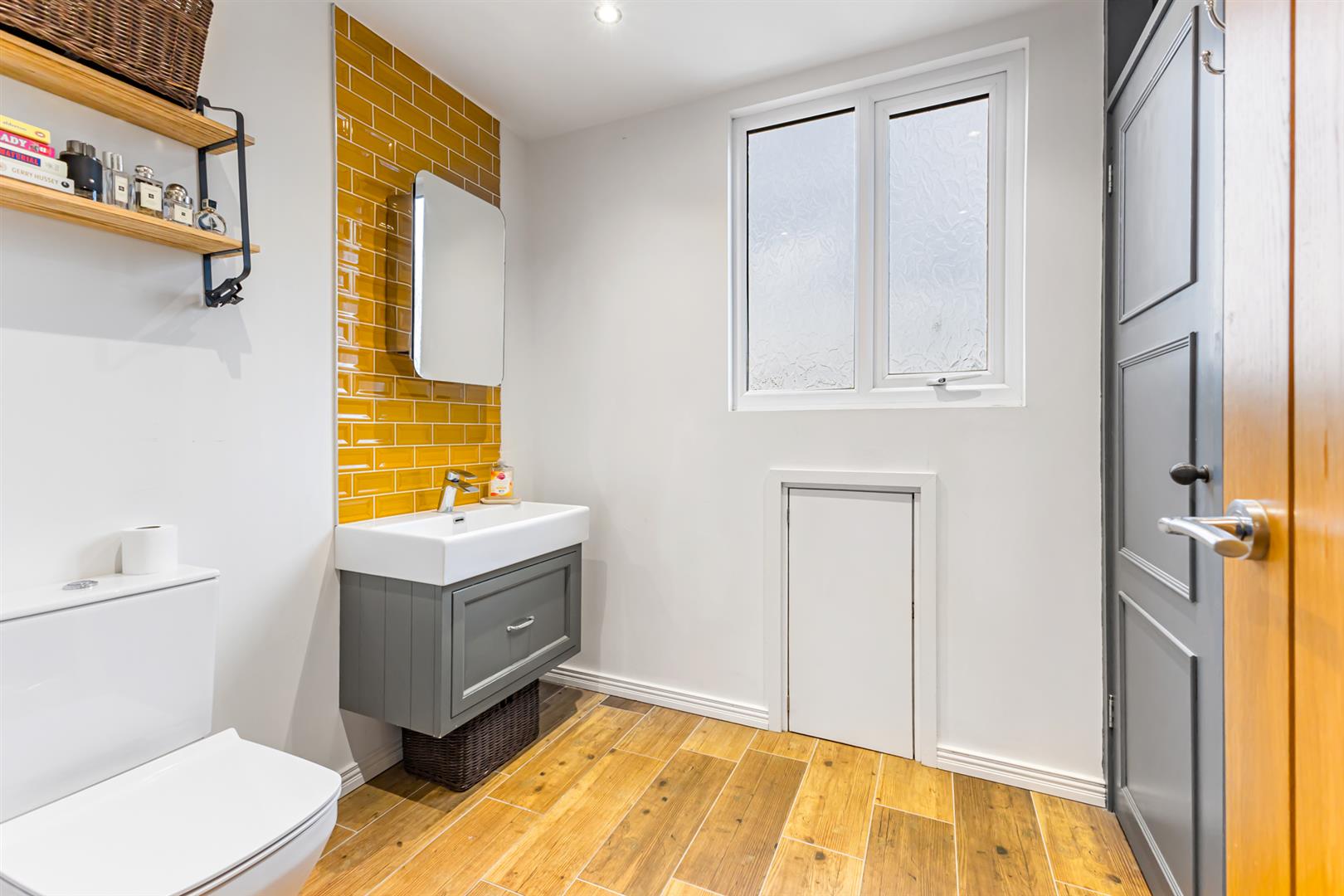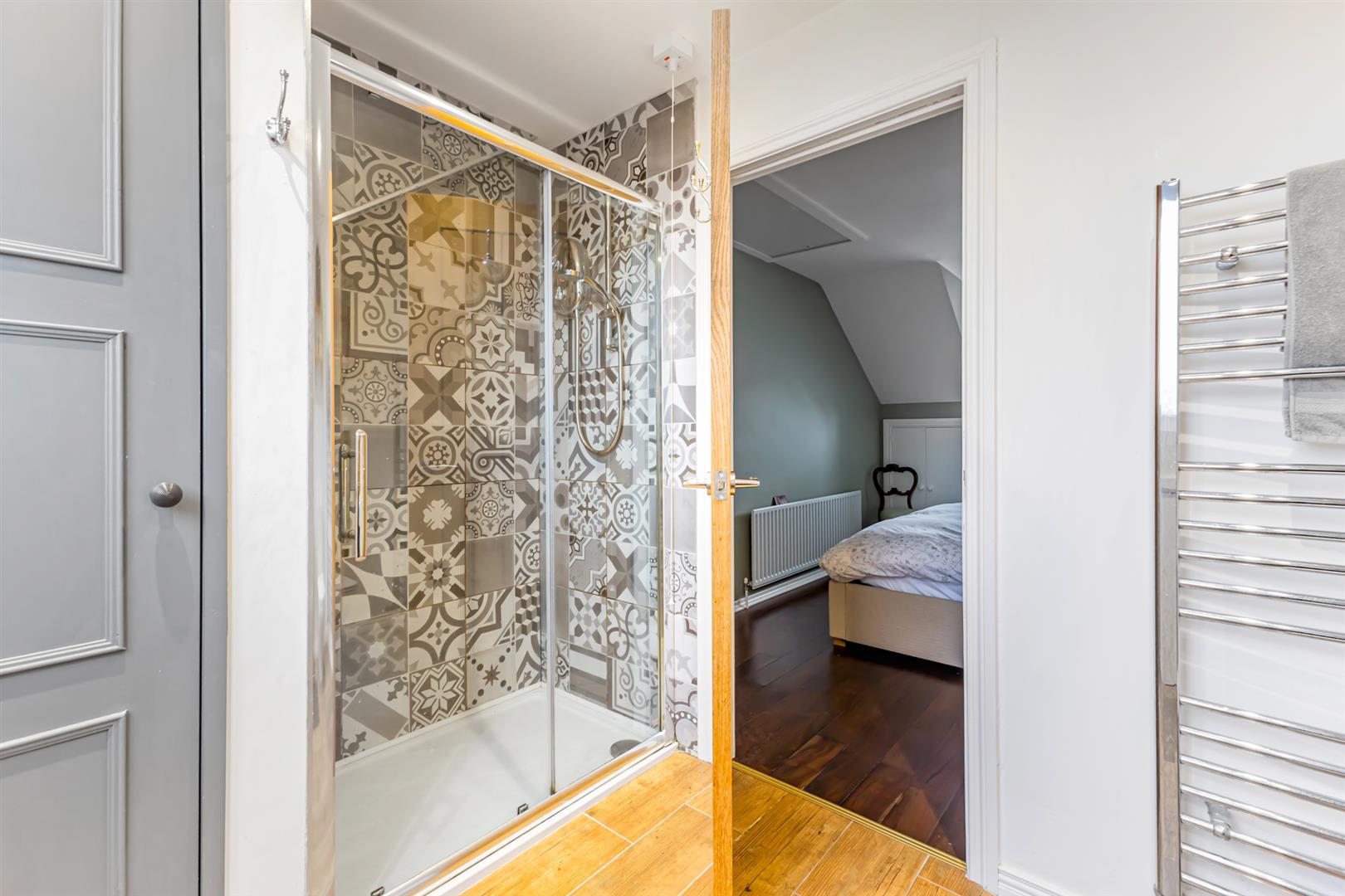 White suite comprising of low flush WC, wash hand basin with mixer tap and storage below, walk-in electric shower unit, partly tiled walls, tiled flooring, in-built storage, recessed spotlighting, extractor fan, vertical chrome heated towel rail.