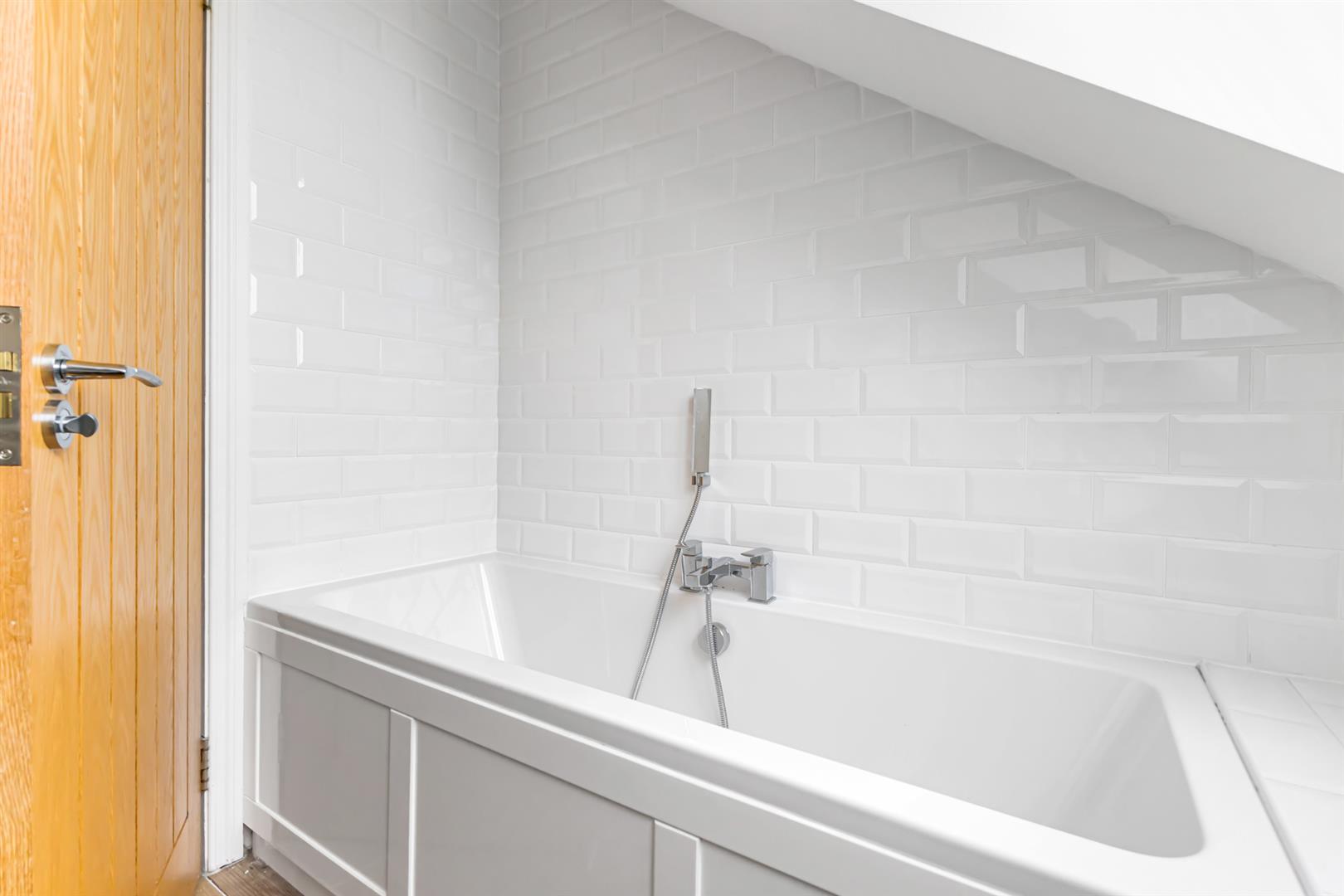 White suite comprising of low flush WC, floating wash hand basin with mixer tap and tiled splashback, panelled bath with hot and cold mixer tap and telephonic shower head, tiled effect flooring, partly tiled walls, vertical heated towel rail, recessed spotlighting, extractor fan.