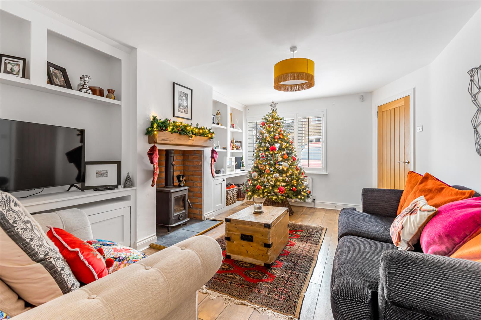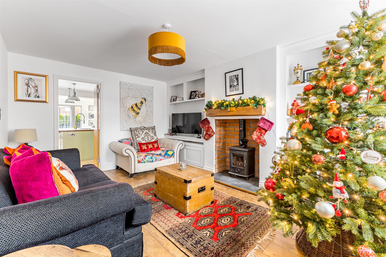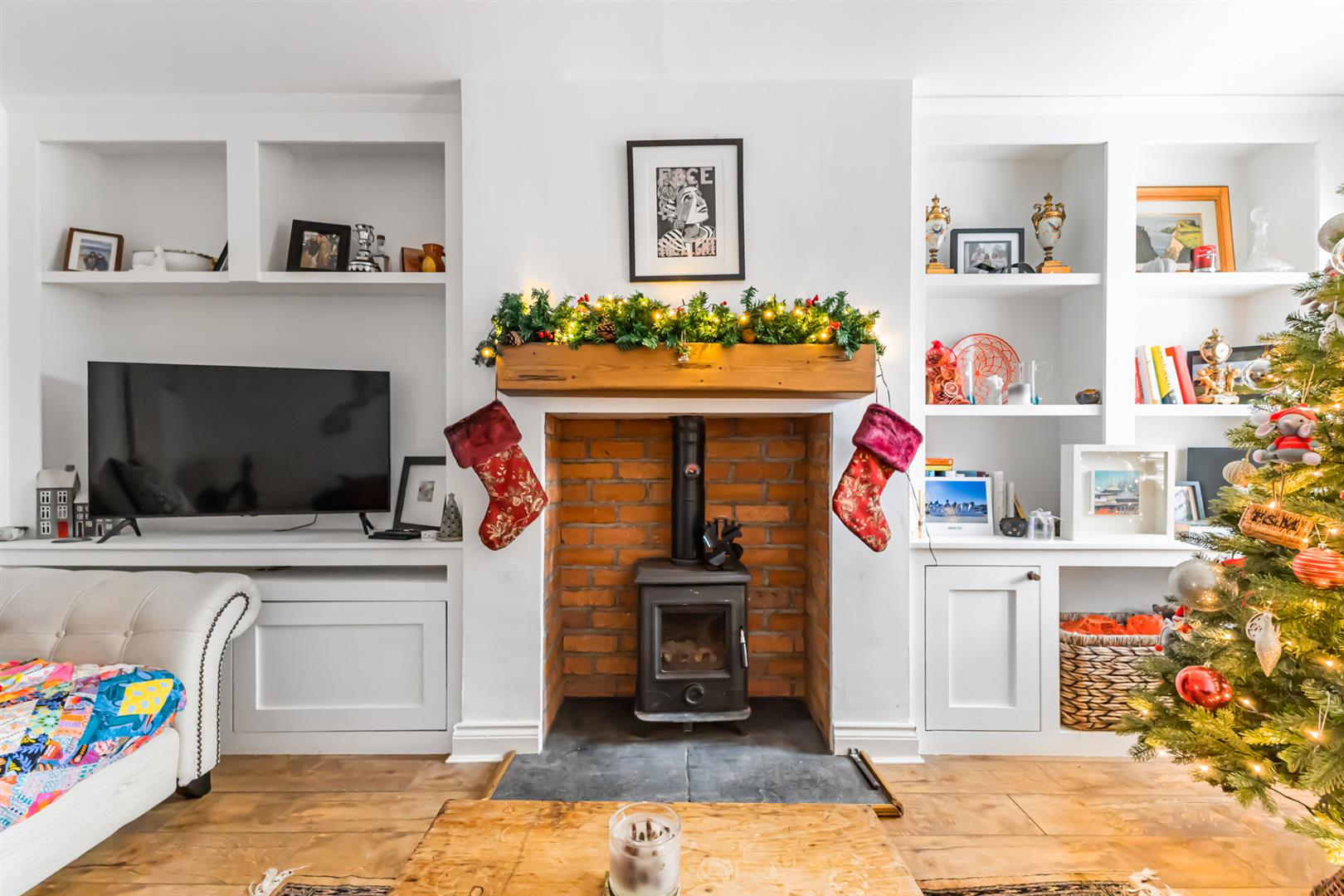 With laminate wood effect flooring, hole in the wall fireplace with brick inset and tiled hearth, standalone multi fuel burning stove, feature wood beam above, in-built shelving units, outlook to front.