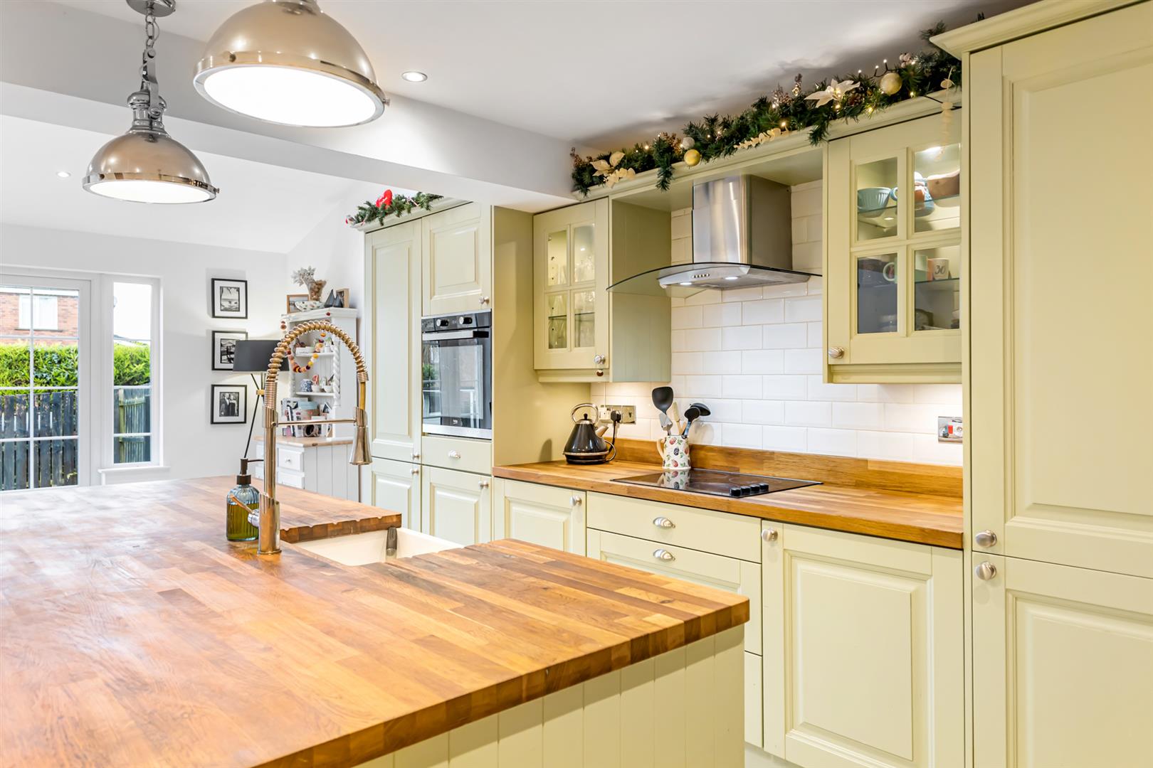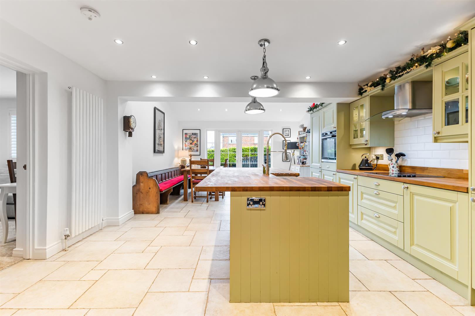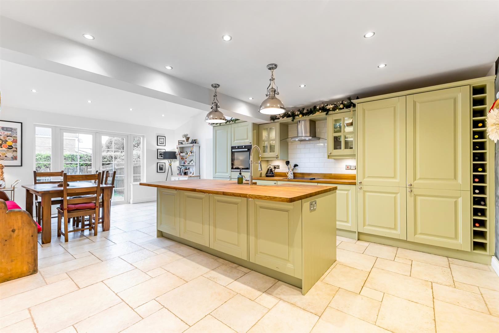 Excellent range of painted high and low level units, hardwood work surface with Belfast ceramic sink unit and drainer with hot and cold mixer tap, four ring electric hob with stainless steel extractor fan hood above, in-built Hoover oven, integrated fridge freezer, integrated dishwasher, island unit, breakfast bar, ample storage, recessed spotlighting, dining/family area with ceramic tiled flooring, recessed spotlighting, Velux windows, double French doors leading through to back garden, excellent range of in-built units, storage underneath stairs,