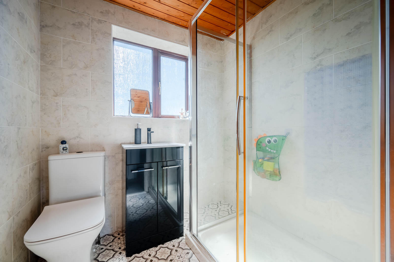 Three piece suite comprising built-in fully tiled shower cubicle, wash hand basin with mixer tap, storage beneath, low flush WC, fully tiled walls, tongue and groove ceiling.