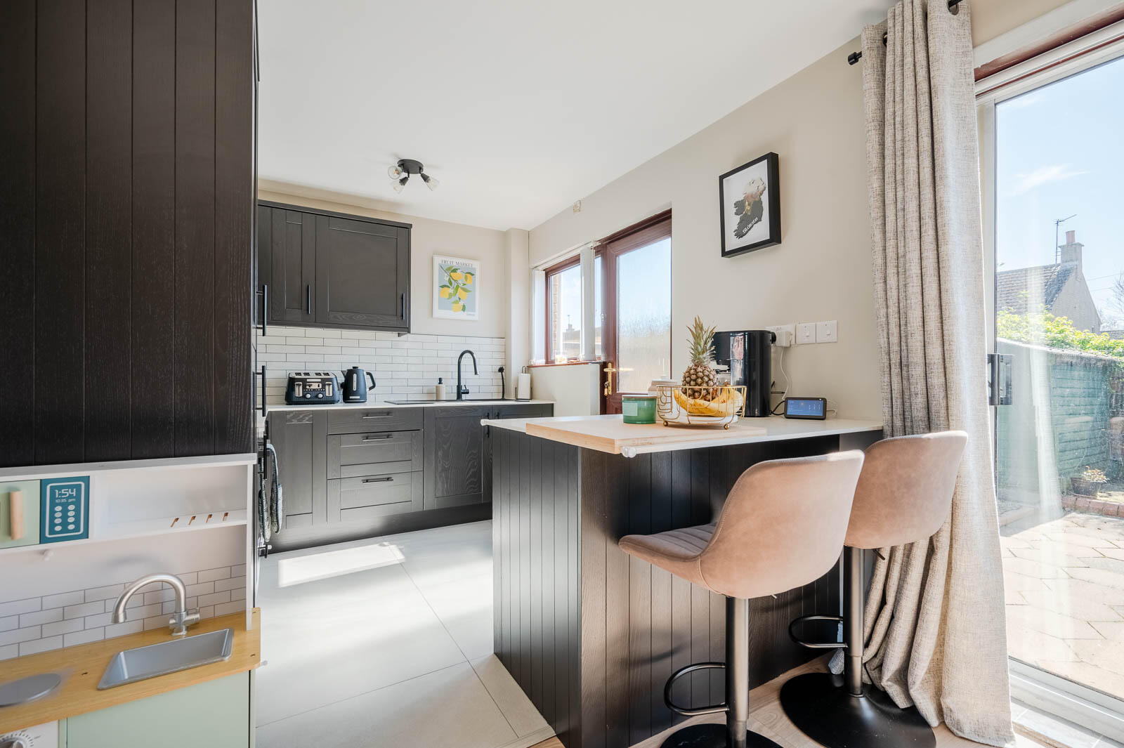 at widest points Archway from living room, range of high and low level units, work surfaces, one and a half bowl single drainer sink unit with mixer tap, integrated four ring hob, tiled splashback, extractor fan above, integrated oven, integrated fridge freezer, integrated washing machine, integrated Slimline dishwasher, part tiled walls, part tiled floor, part laminate wood effect floor, breakfast bar, double glazed sliding patio door to rear garden.