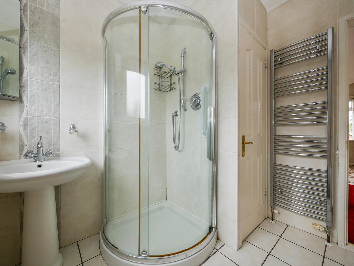 White suite comprising panelled bath, mixer taps, telephone hand shower, low flush w/c, pedestal wash hand basin, fully tiled walls, corner shower cubicle with thermostatically controlled shower, tiled floor, recessed spotlights, wall mounted radiator, hot press.