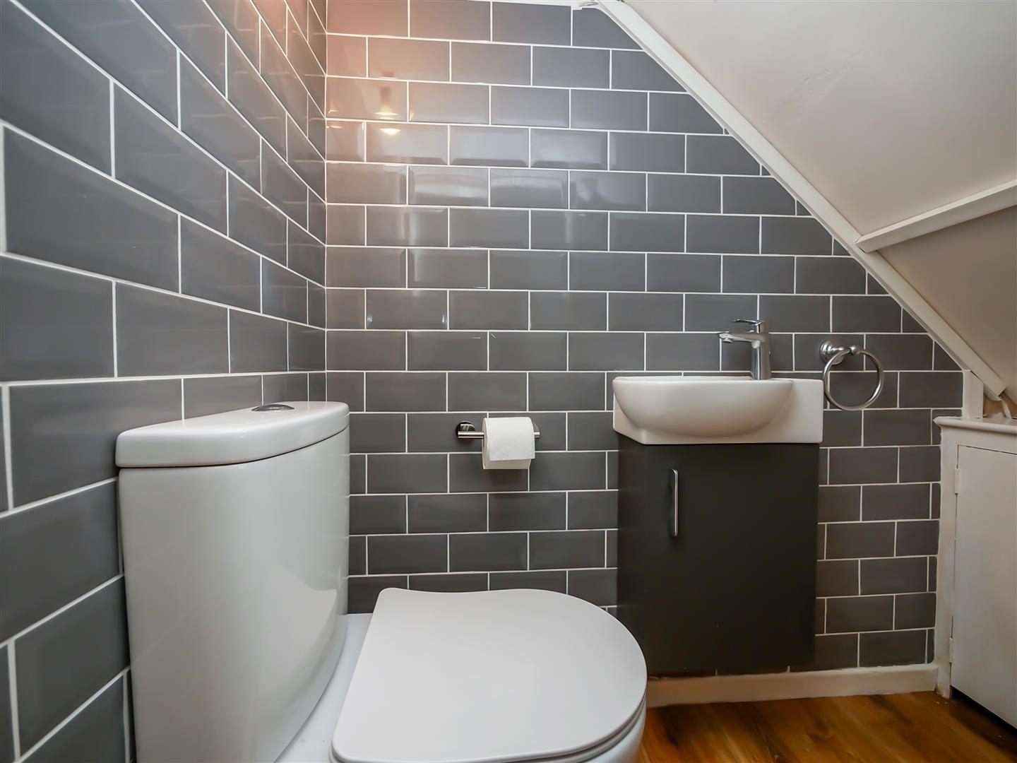 Ground floor w/c comprising low flush w/c, wash hand basin, part tiled walls.