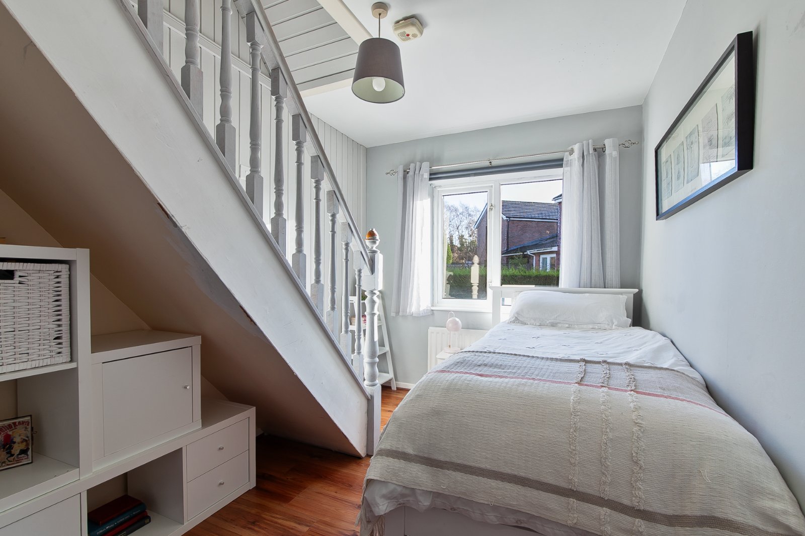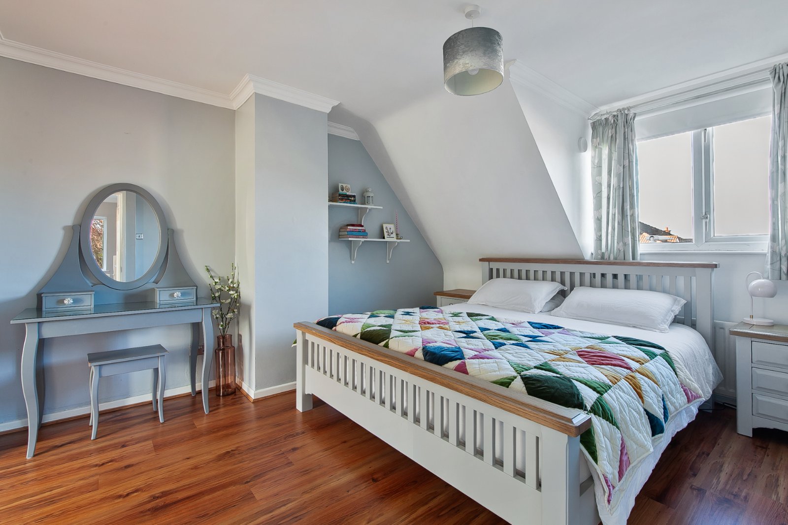 The deceptive accommodation comprises a generous living room with feature bay window, separate dining room and a modern kitchen leading to a sun room to complete the ground floor. The principal bedroom is bright and spacious with an en suite dressing room while bedroom two features a fixed staircase to a floored attic room and the third bedroom is of a good size. The family bathroom offers both a free-standing bath and a separate shower cubicle. Externally there is a good driveway parking leading to a detached garage currently used as an excellent home gym.
