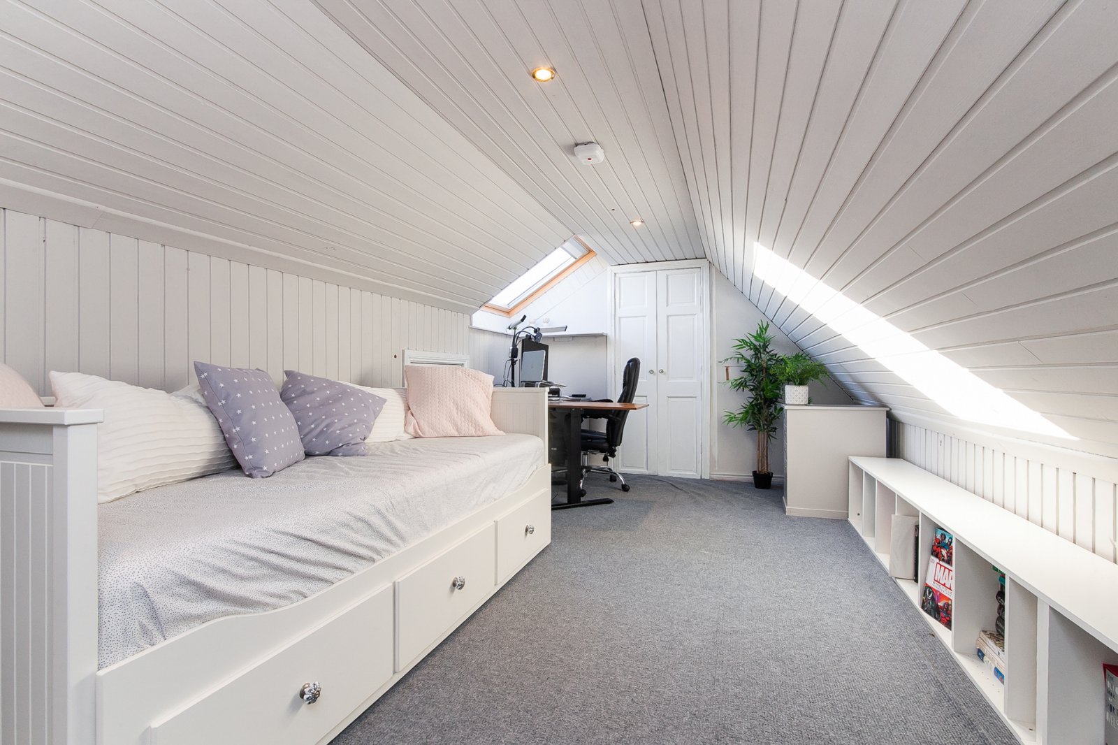 Tongue and groove walls and ceiling, storage in eaves, Velux window, shelved storage cupboard