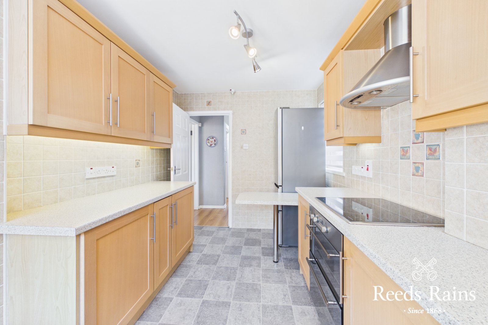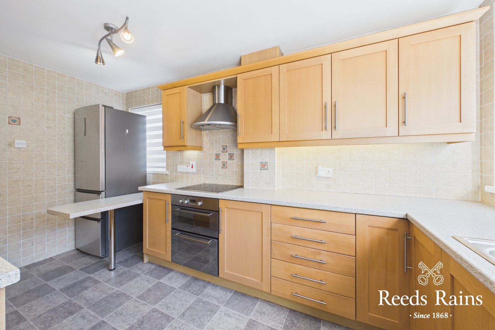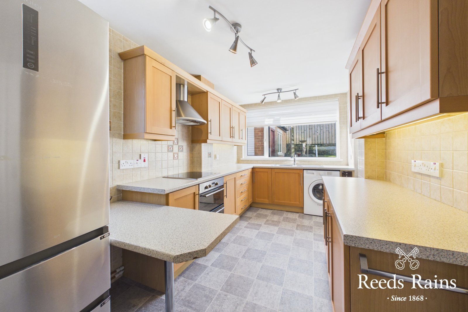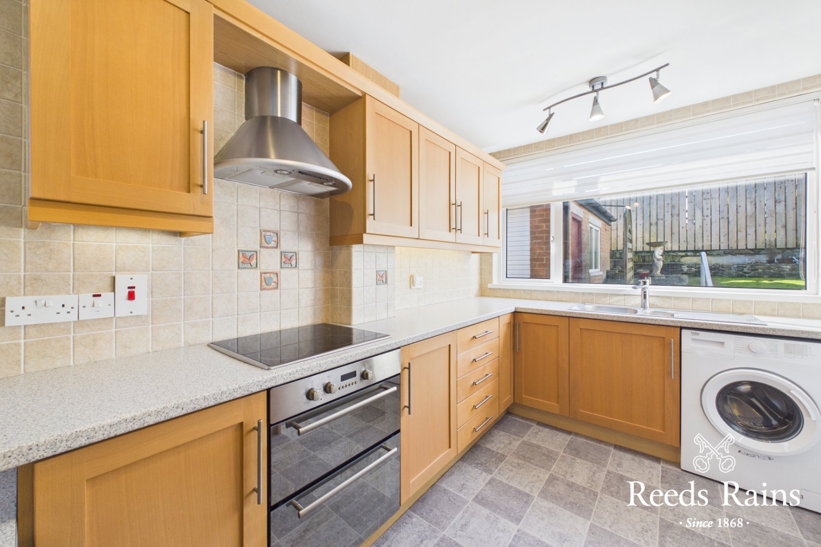 Range of high and low level units with stainless steel door furniture. Built in stainless steel double oven., four ring ceramic hob and stainless steel extractor fan. Breakfast bar. Part tiled walls. Space for fridge freezer. Single drainer 1.5 stainless steel sink unit with mixer taps. Plumbed for washing machine. PVC door to garden.