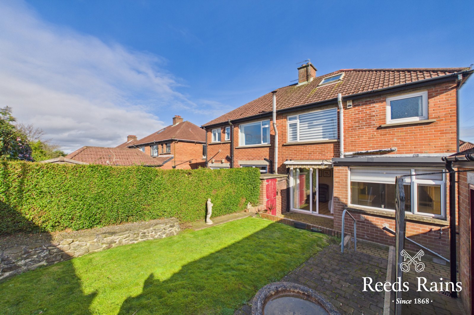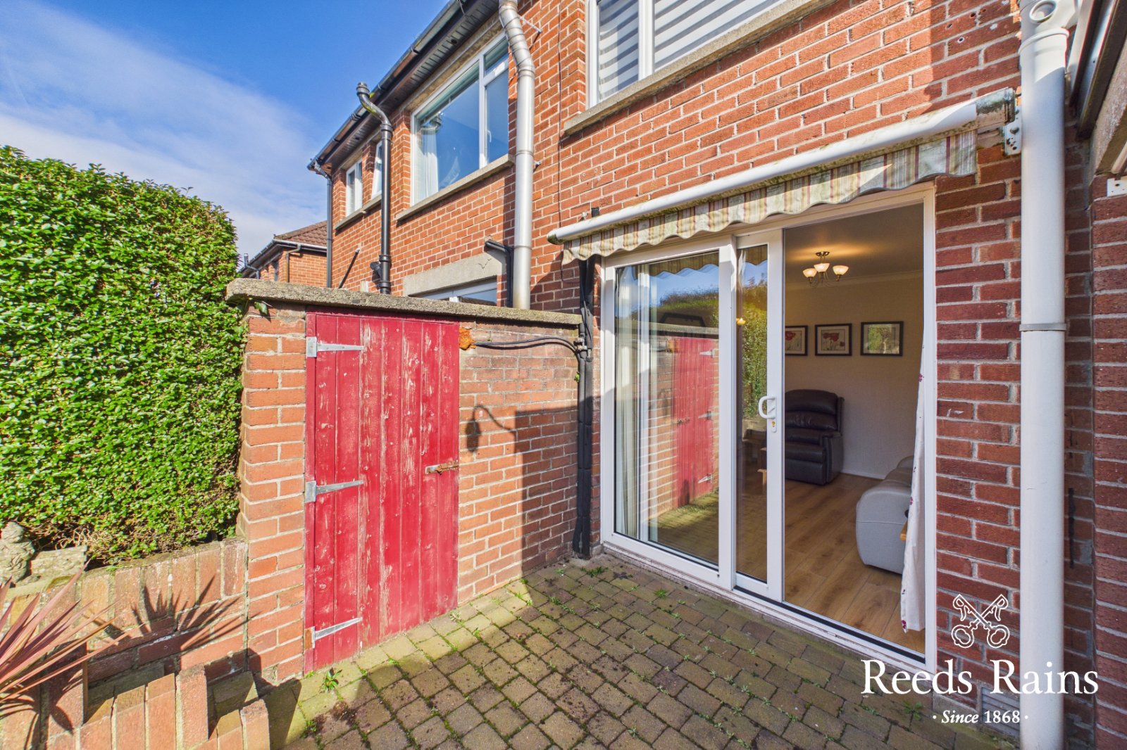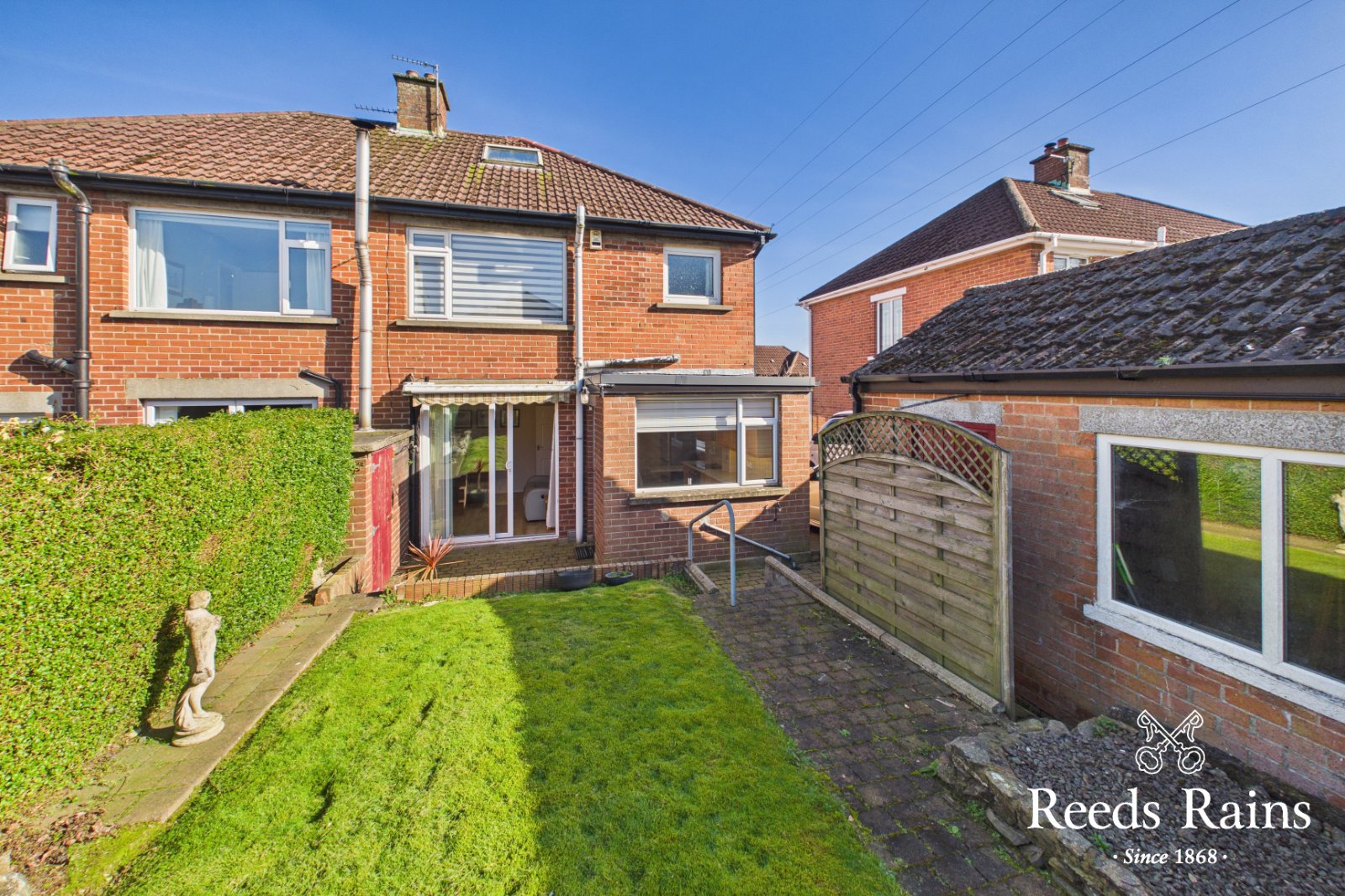 Rear garden in lawn, hedging & brick paviour walkways. Garden store. Brick paviour driveway to ample parking space to side. Remote control awning.