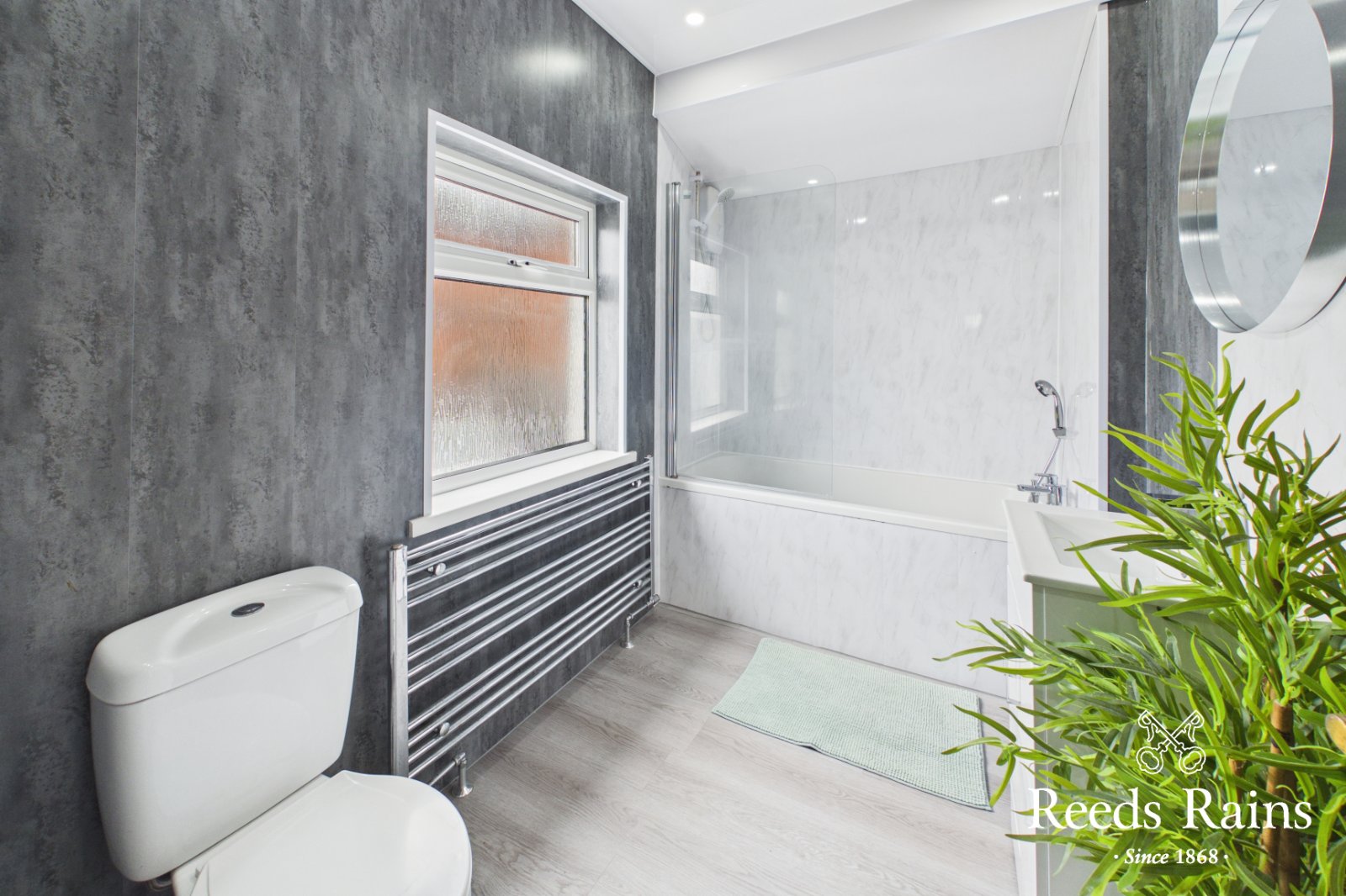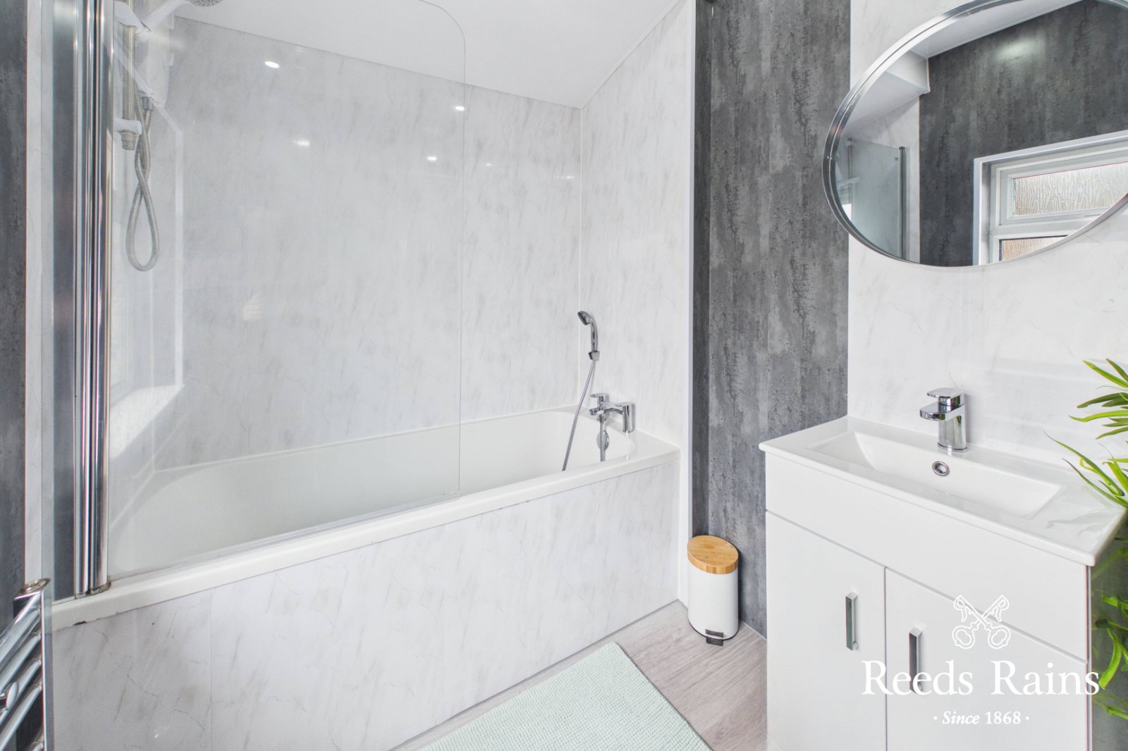 Panel bath with mixer taps and telephone hand shower & shower screen. Additional electric shower over bath. Vanity unit with mono tap. PVC panelled walls. Low flush WC. Spotlights. Heated towel rail.