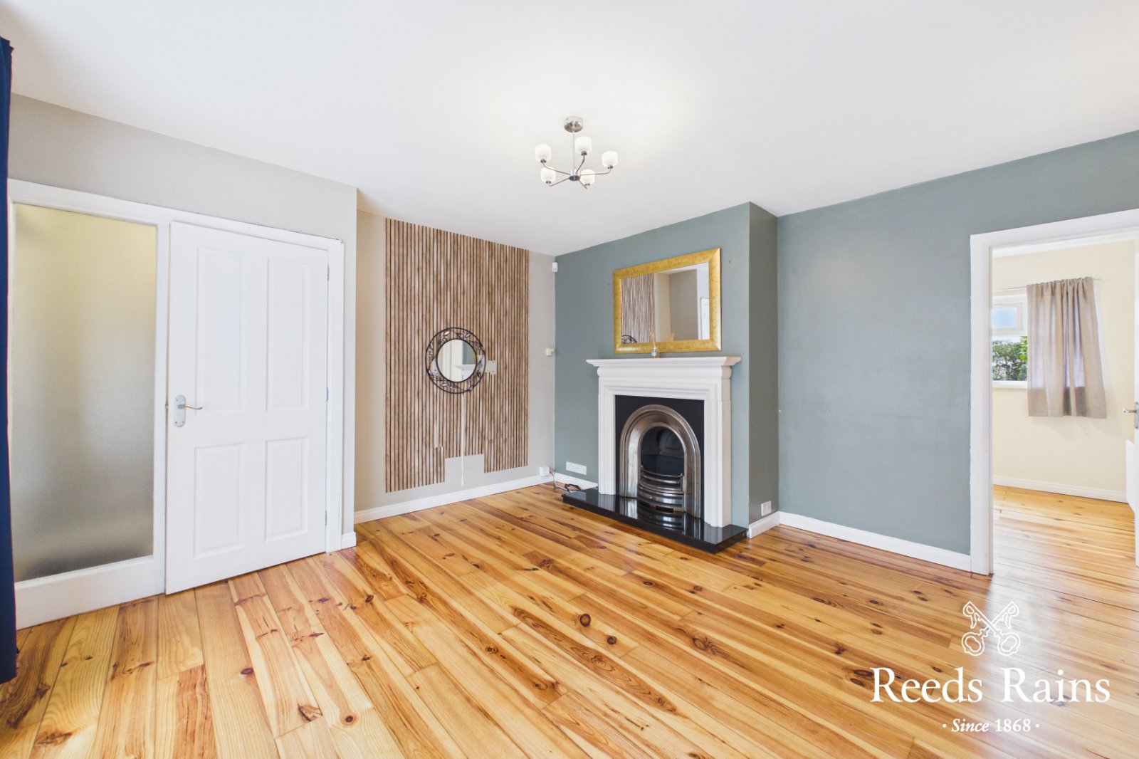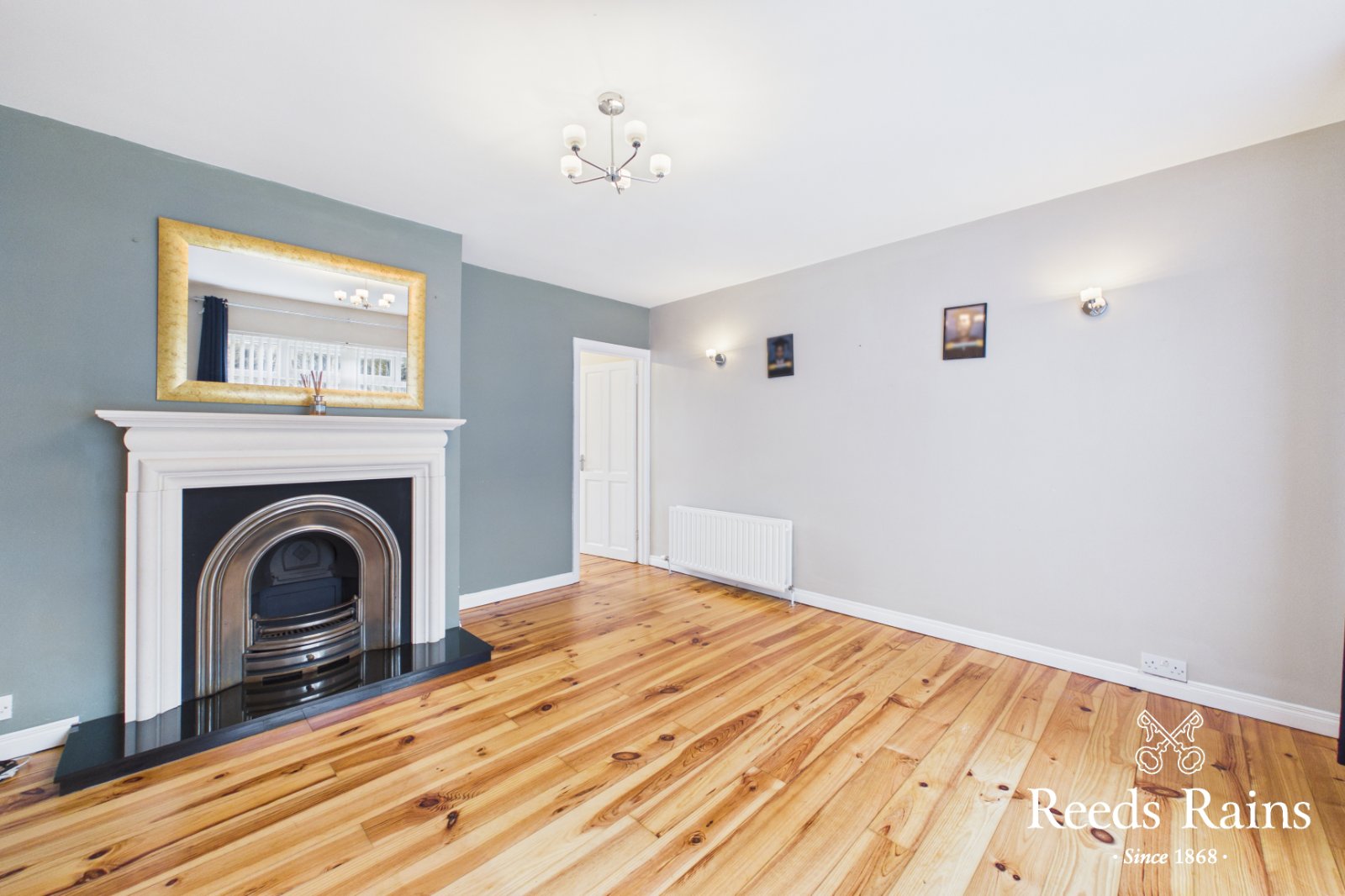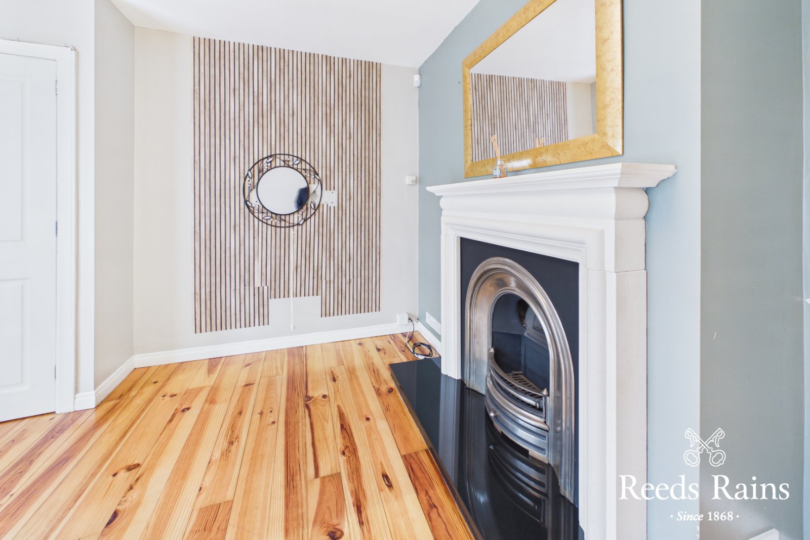 Feature fireplace and wooden flooring.