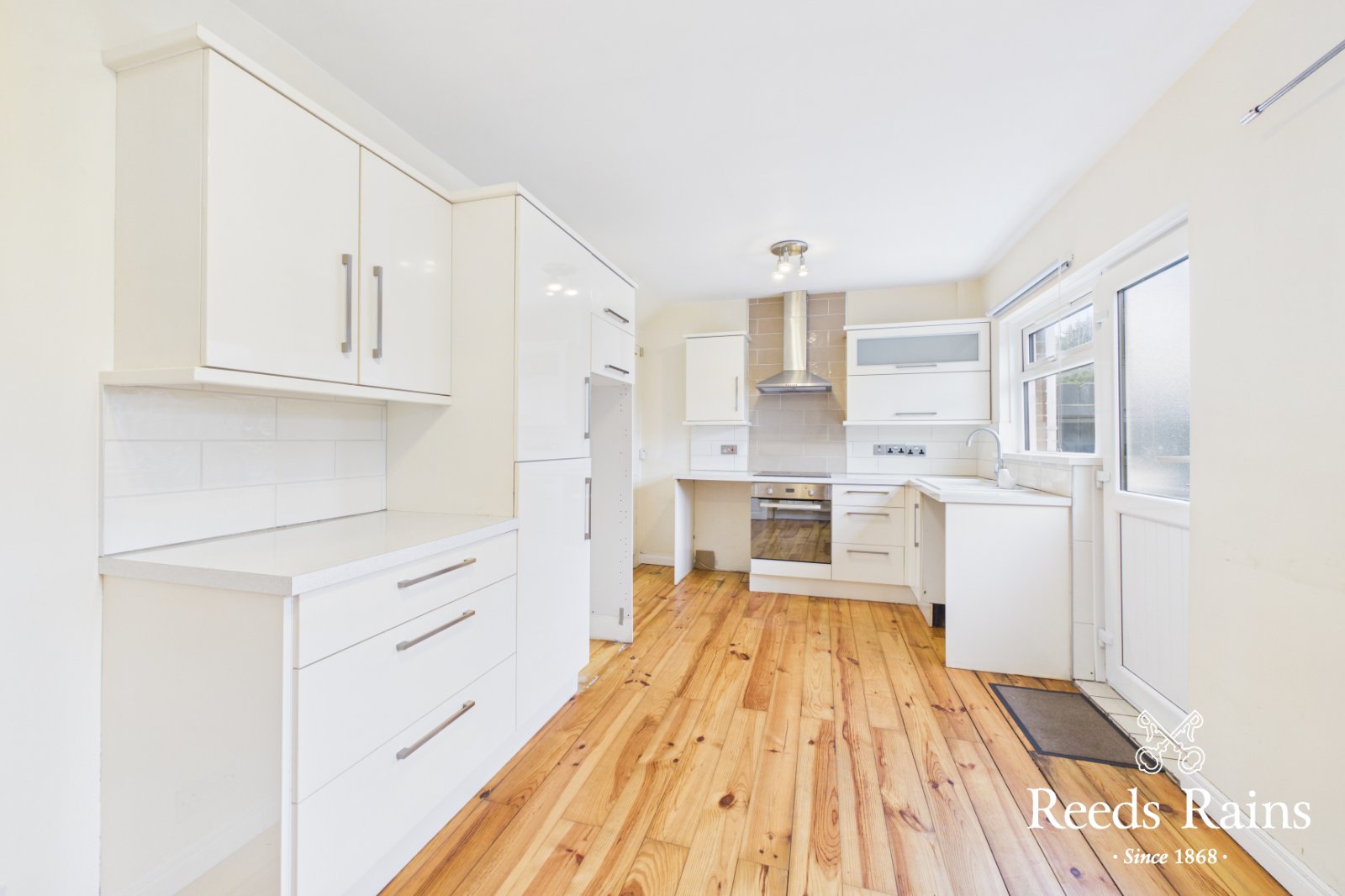 Range of high and low level units. Ceramic sink with mixer taps. Built in stainless steel oven and extractor fan. Space for fridge freezer. Storage under stairs. PVC door to rear. Feature wooden flooring.