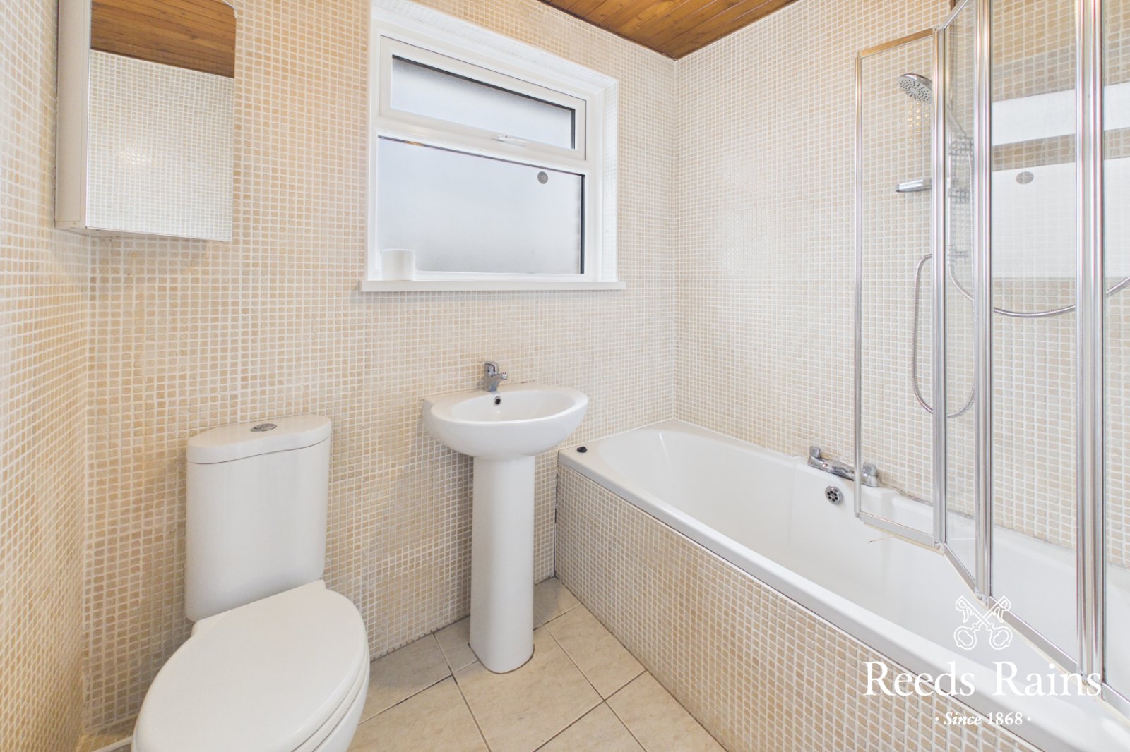 Panel bath with mixer taps and shower screen. Pedestal wash hand basin. Low flush WC.
