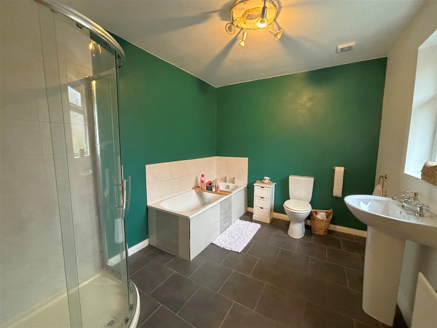 White suite with chrome fitments comprising panelled bath, pedestal wash hand basin, low flush wc, shower cubicle, thermostatically controlled shower unit fully tiled, partly tiled walls, ceramic tiled floor, double panelled radiator.