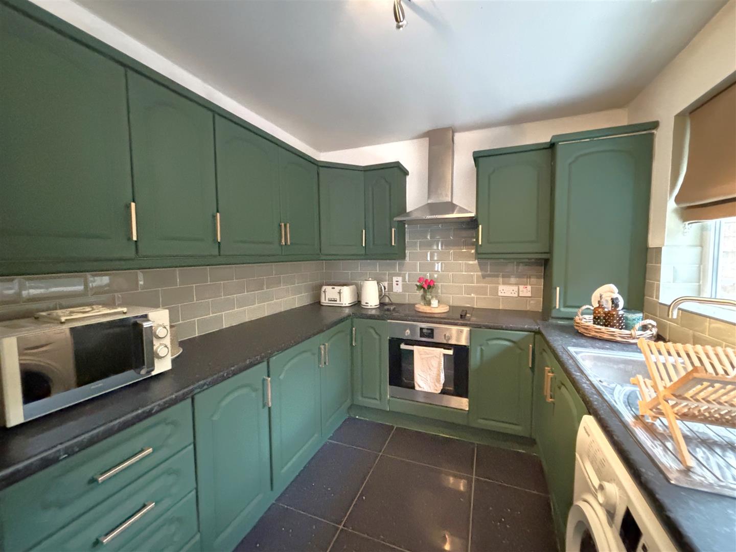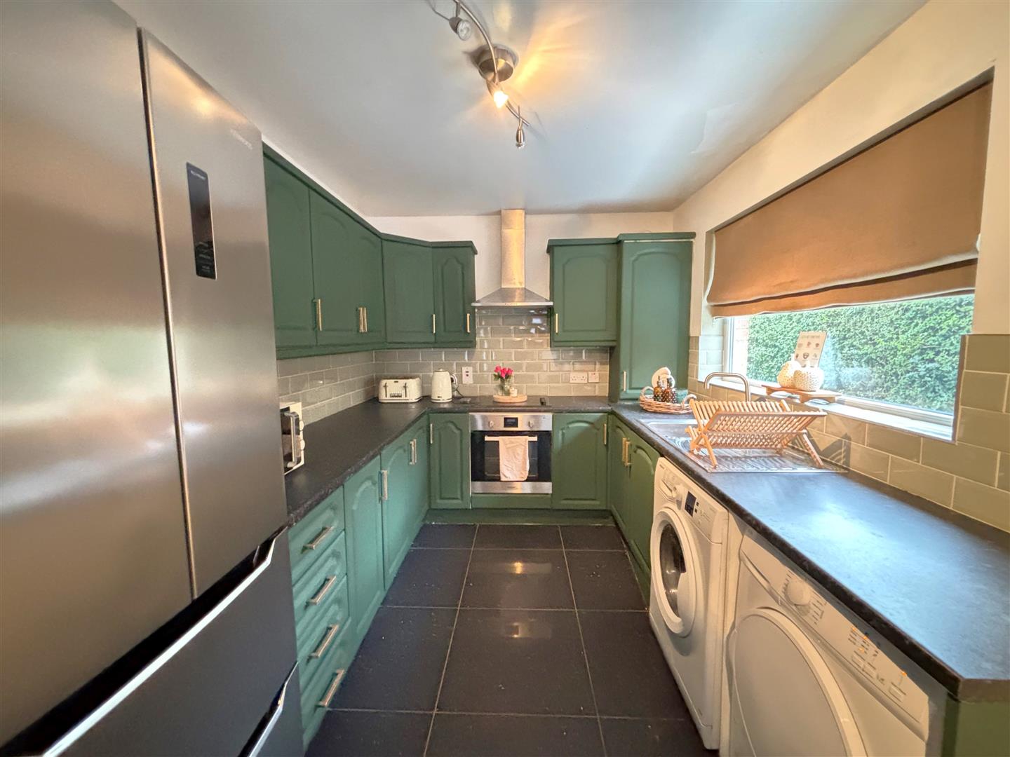 Single drainer stainless steel sink unit, range of high and low level units, formica worktops, built-under oven and ceramic hob, stainless steel canopy extractor fan, fridge/freezer space, plumbed for washing machine, tumble dryer space, partly tiled walls, partially tiled walls, porcelain tiled floor, double panelled radiator, breakfast bar.