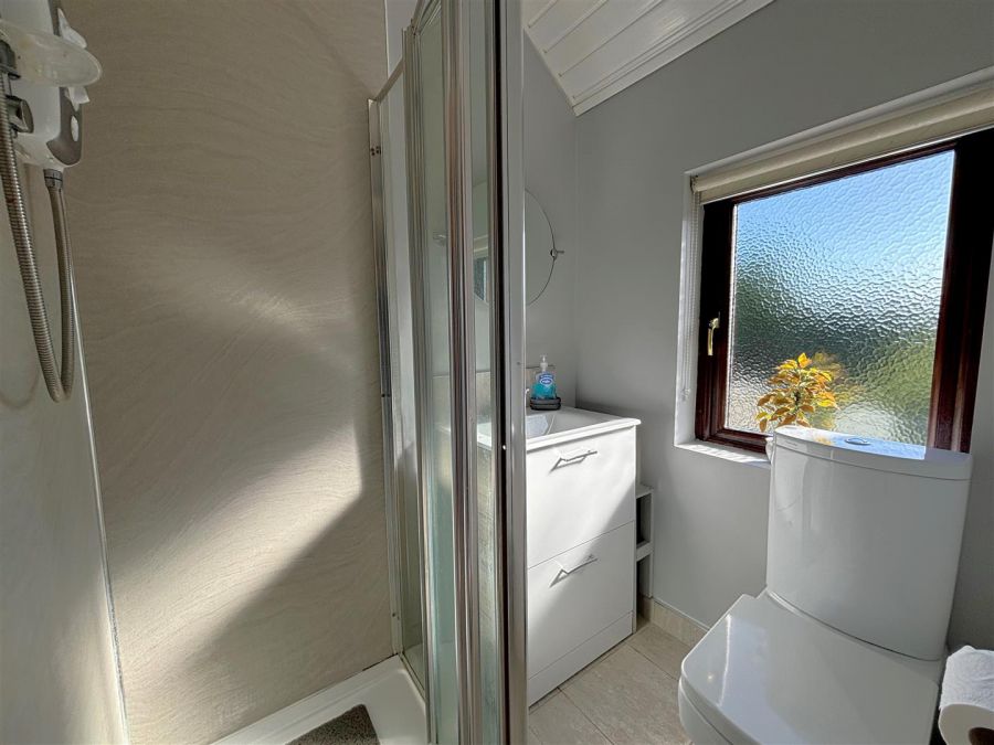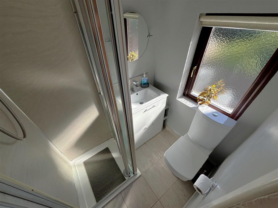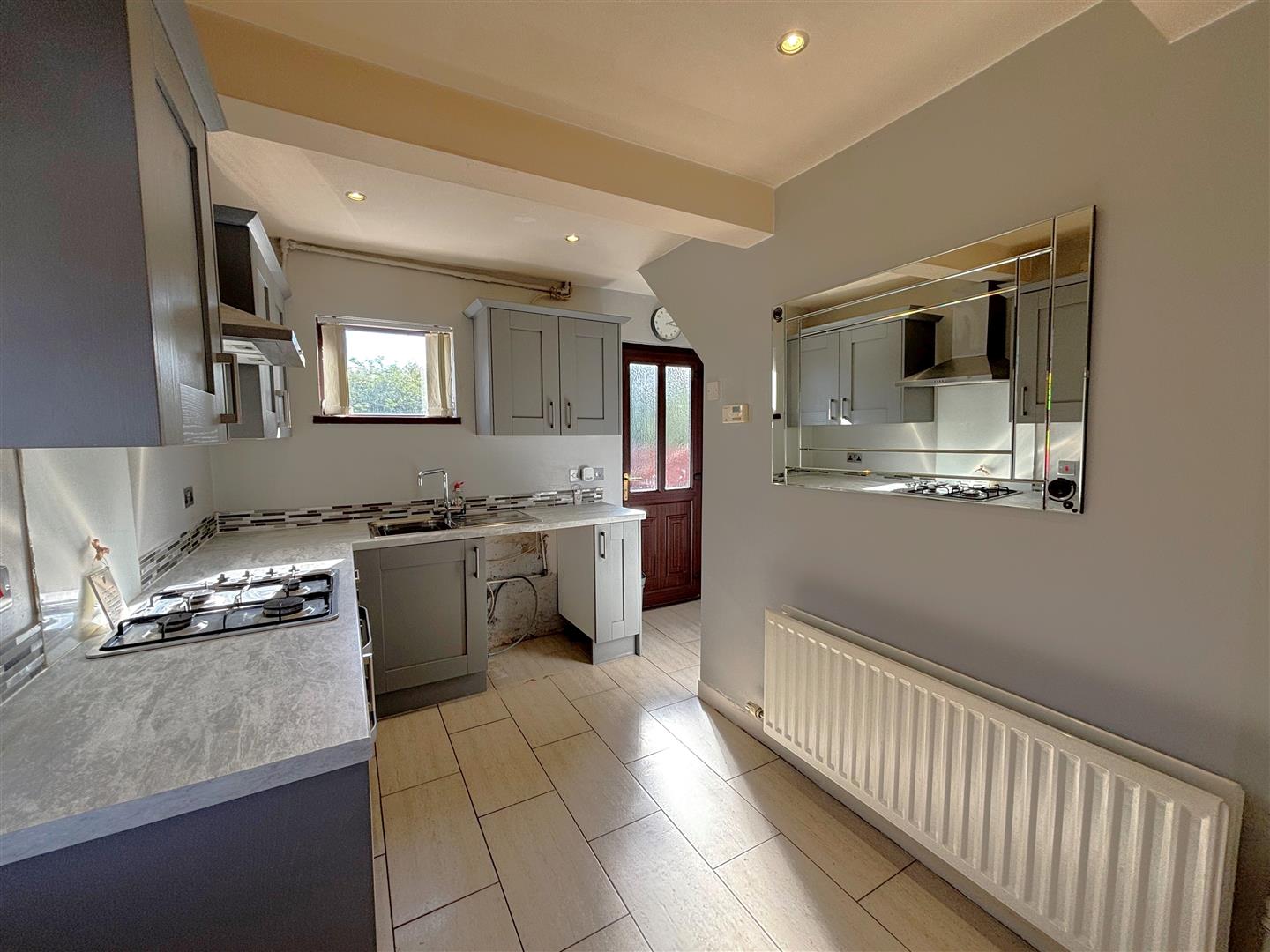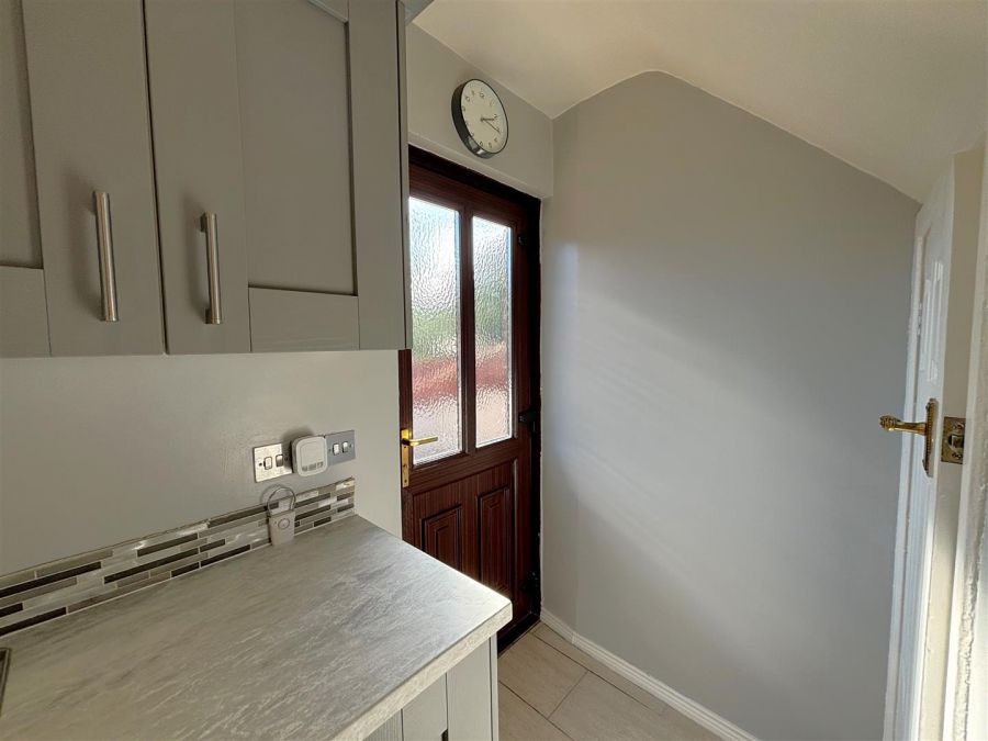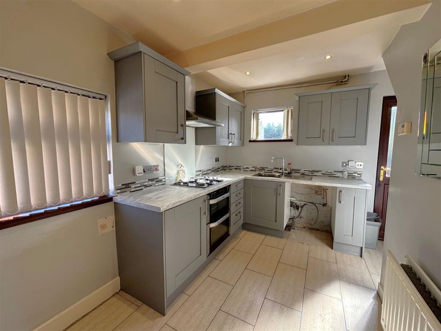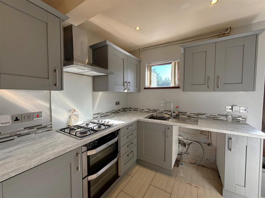 Single drainer stainless steel sink unit, range of high and low level units, formica worktops, 4 ring gas hob, steel under oven and grill, glass splash back, stainless steel canopy extractor fan, integrated fridge, plumbed for washing machine, fridge/freezer space, partly tiled walls, ceramic tiled floor, pvc door to rear, understairs cloaks.