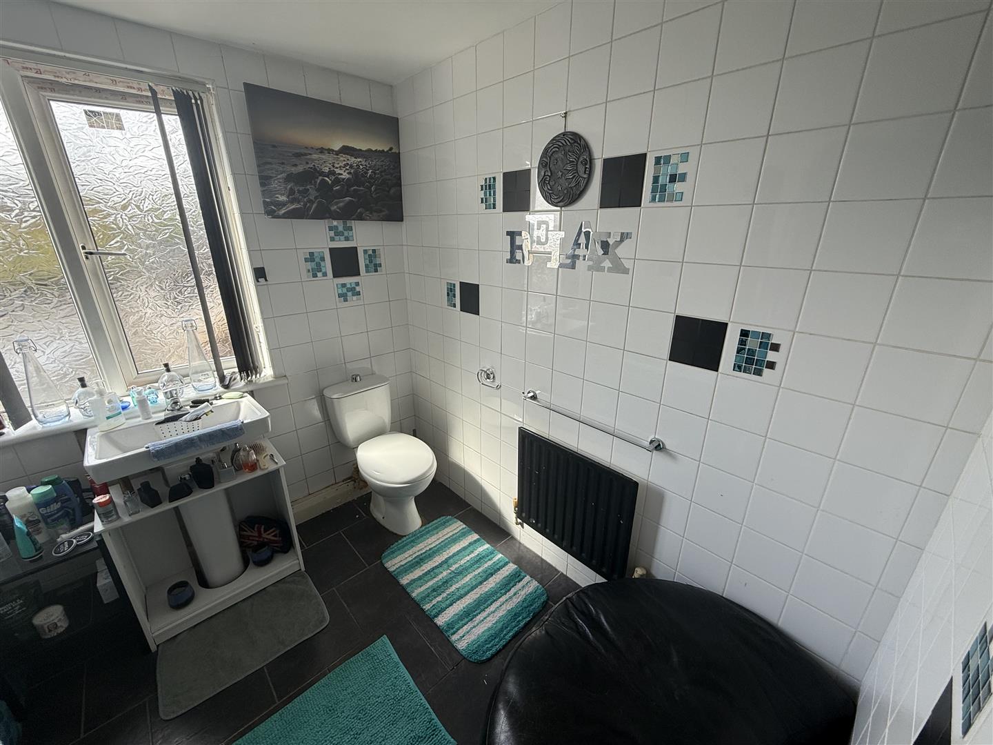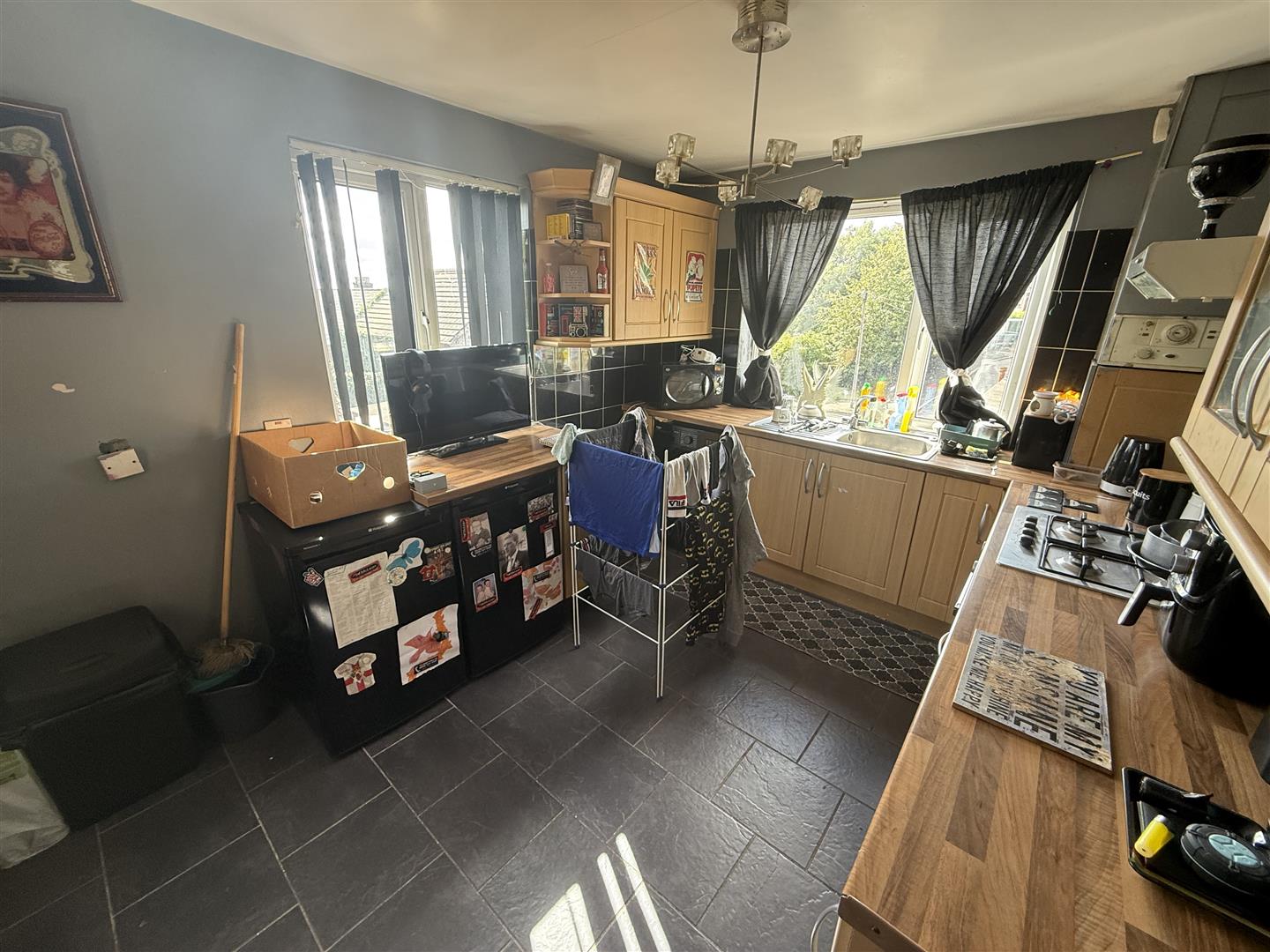 Single drainer stainless steeel sink unit, range of high and low level units, formica worktops, built-in under oven and gas hob, extractor fan, plumbed for washing machine, under fridge and freezer space, panelled radiator, ceramic tiled floor, partly tiled walls, upvc double glazed rear door, wall mounted gas boiler.