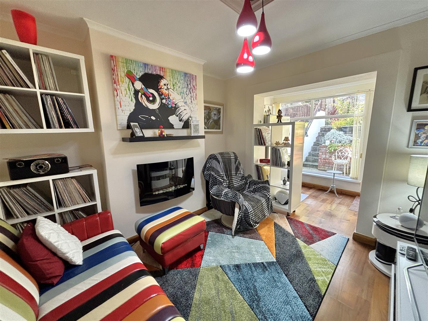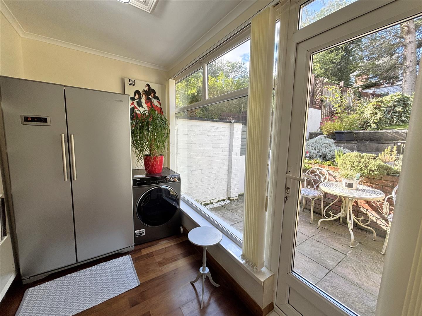 Wood laminate floor, uPvc double glazed rear door.
