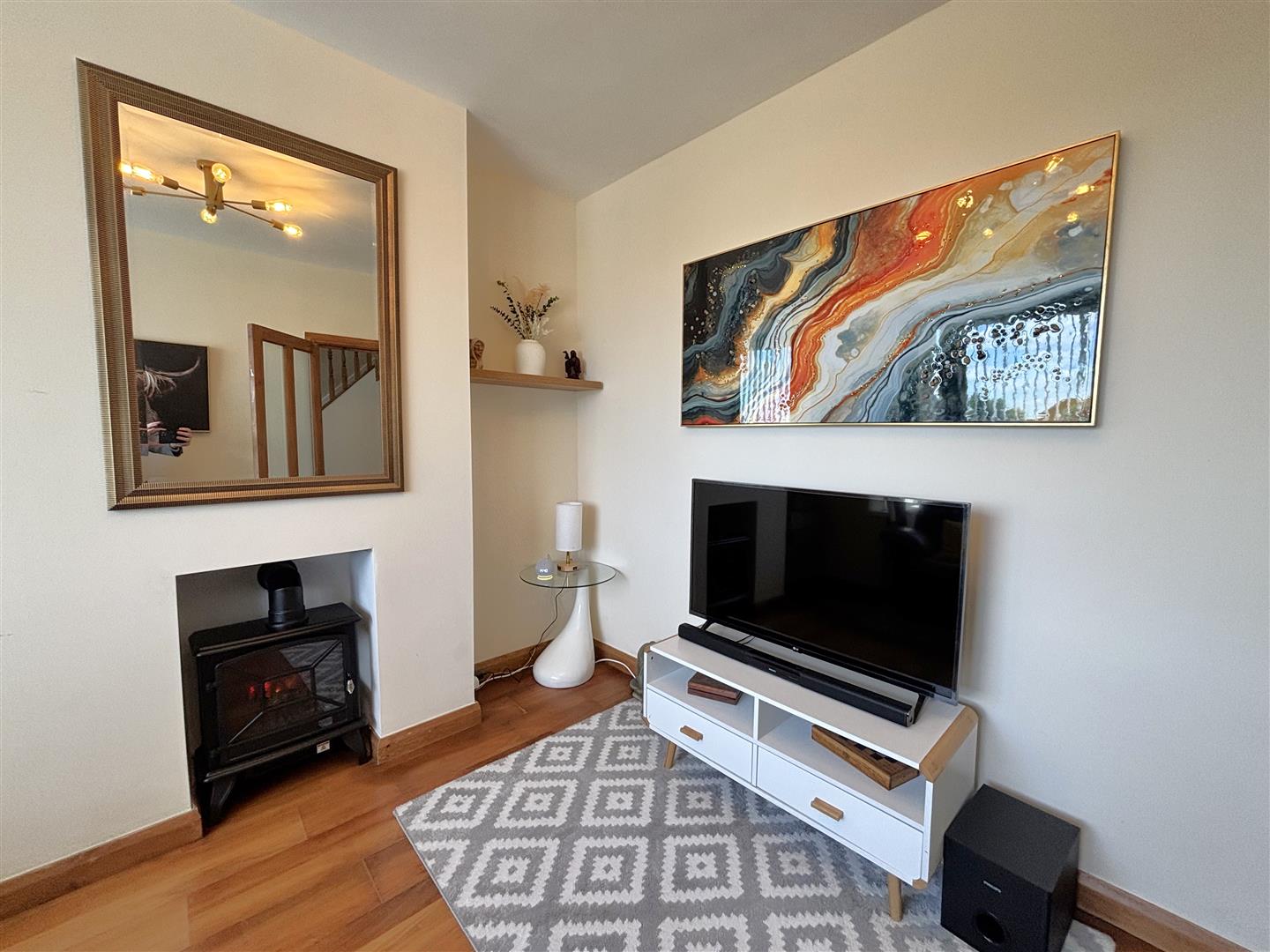 Upvc double glazed entrance door, wood laminate floor, panelled radiator, understairs cloaks, gas boiler, wood laminate floor.