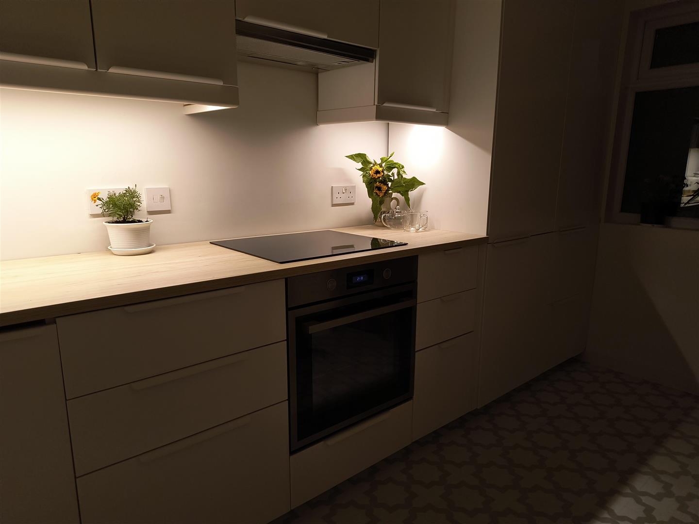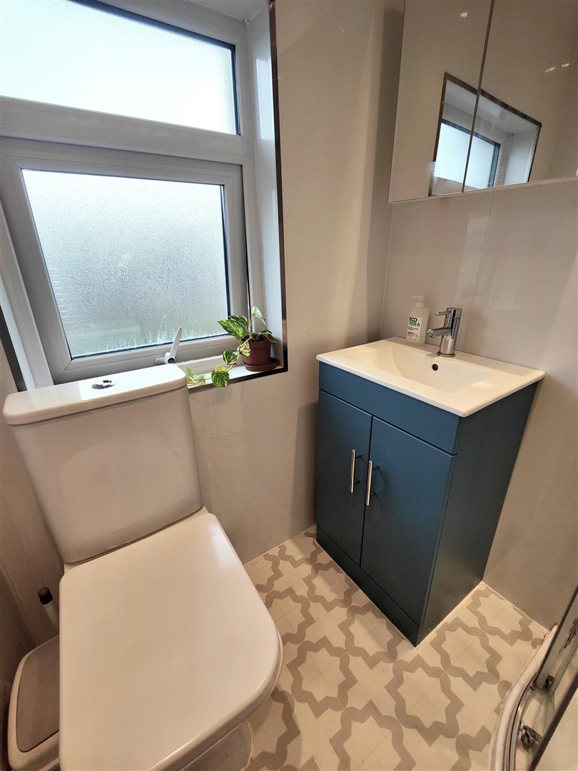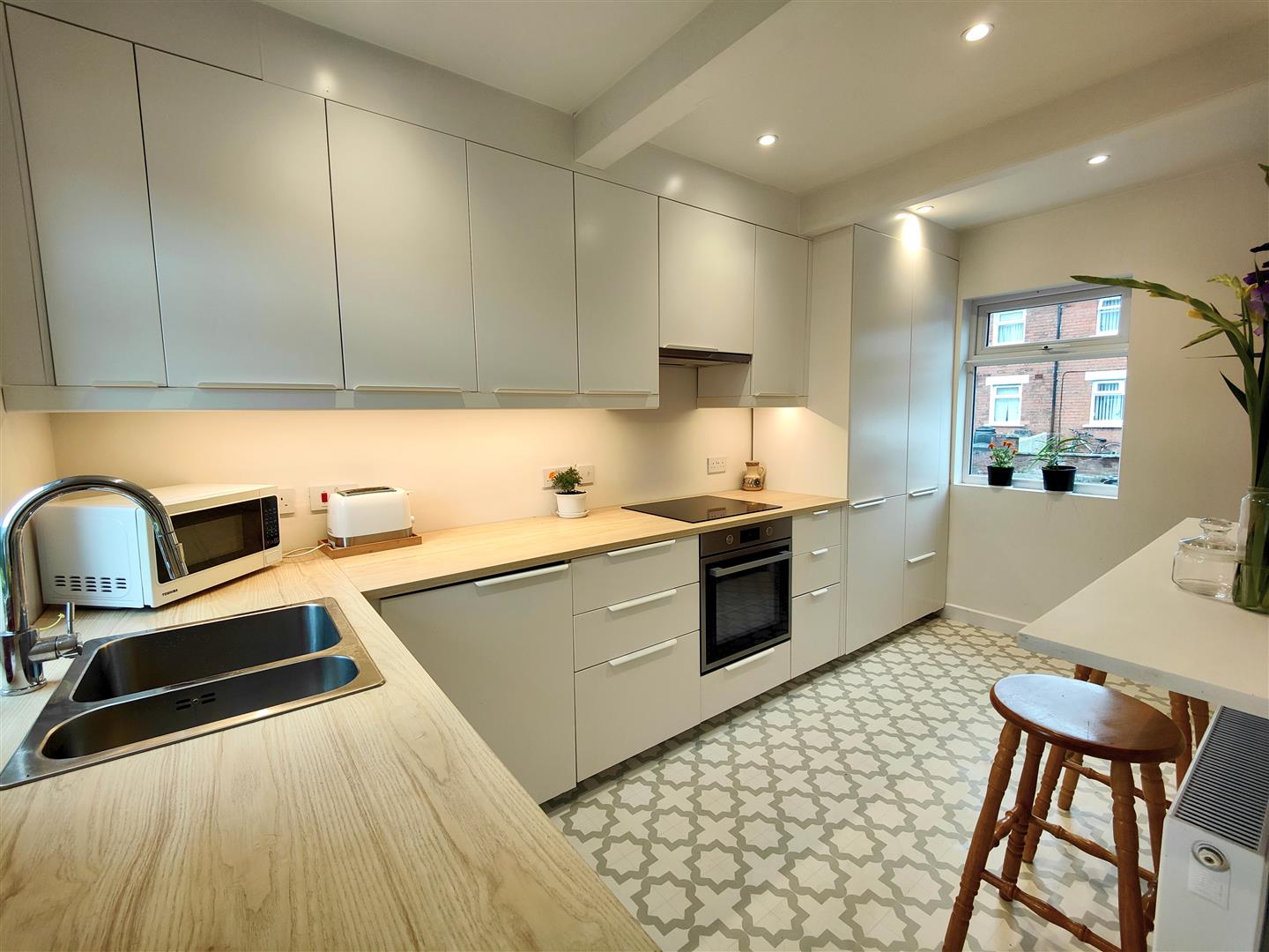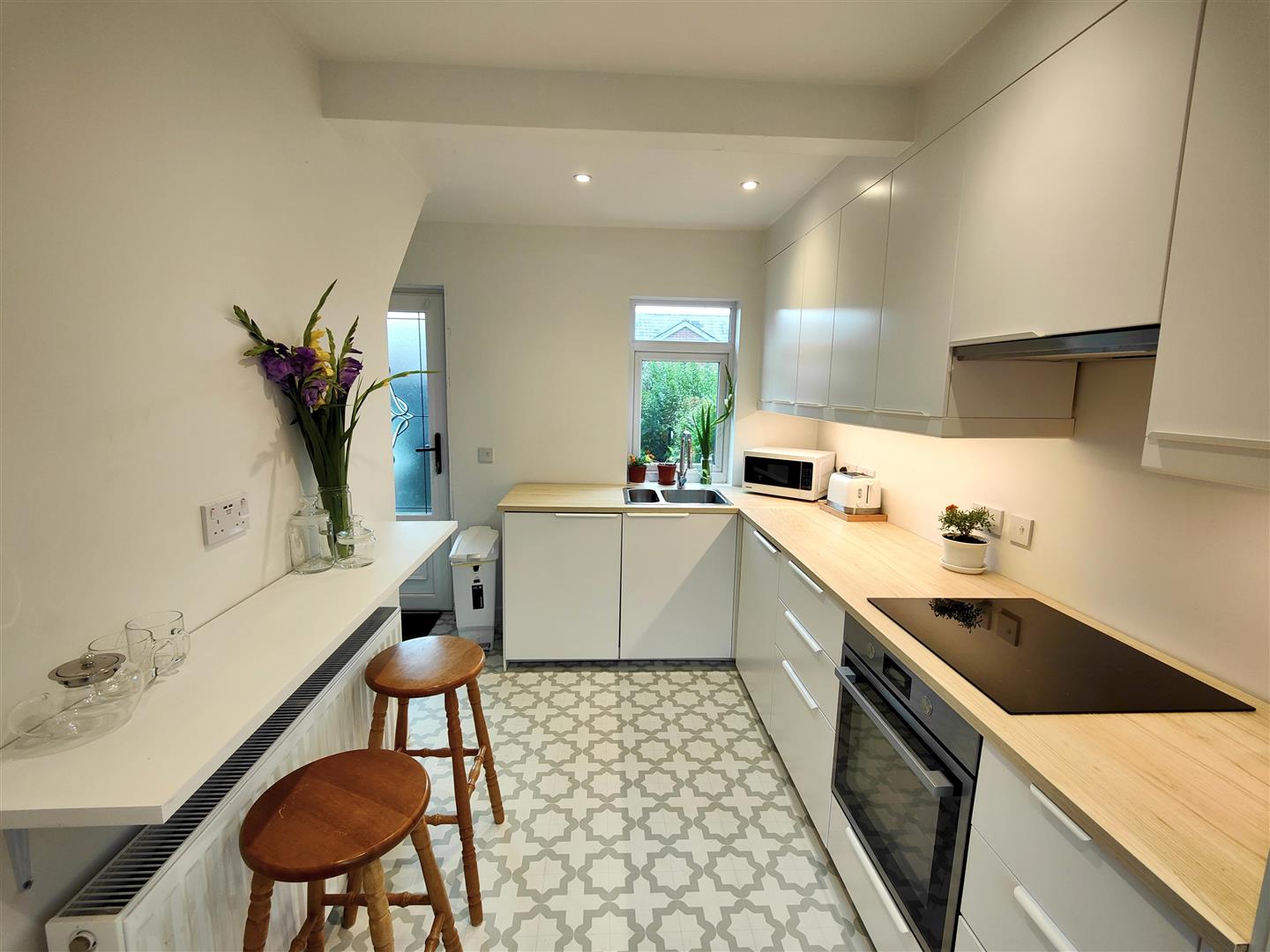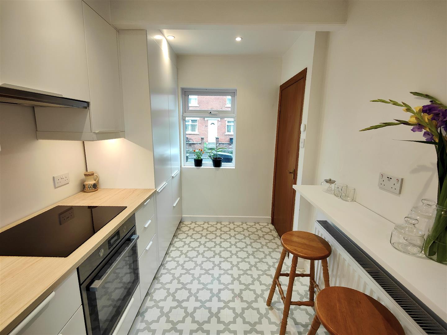 glass induction hob, integrated extractor fan, integrated fridge/freezer, tall larder, integrated washing machine, breakfast bar, recessed lighting, panelled radiator Upvc double glazed rear door. Under stairs cloaks.