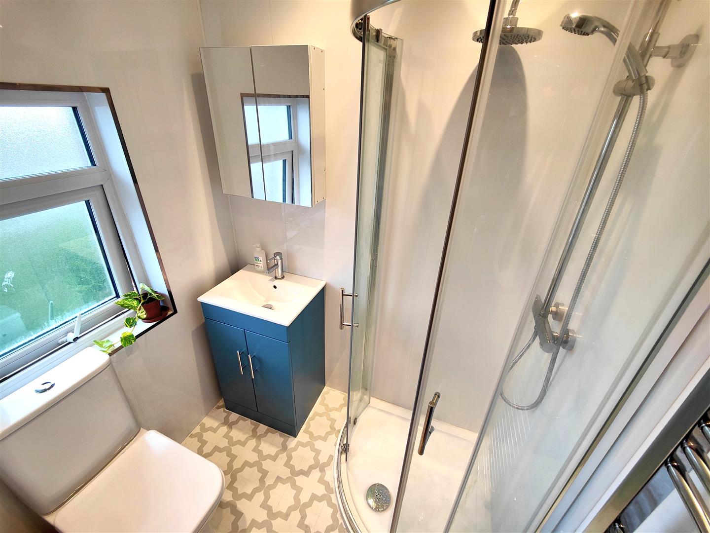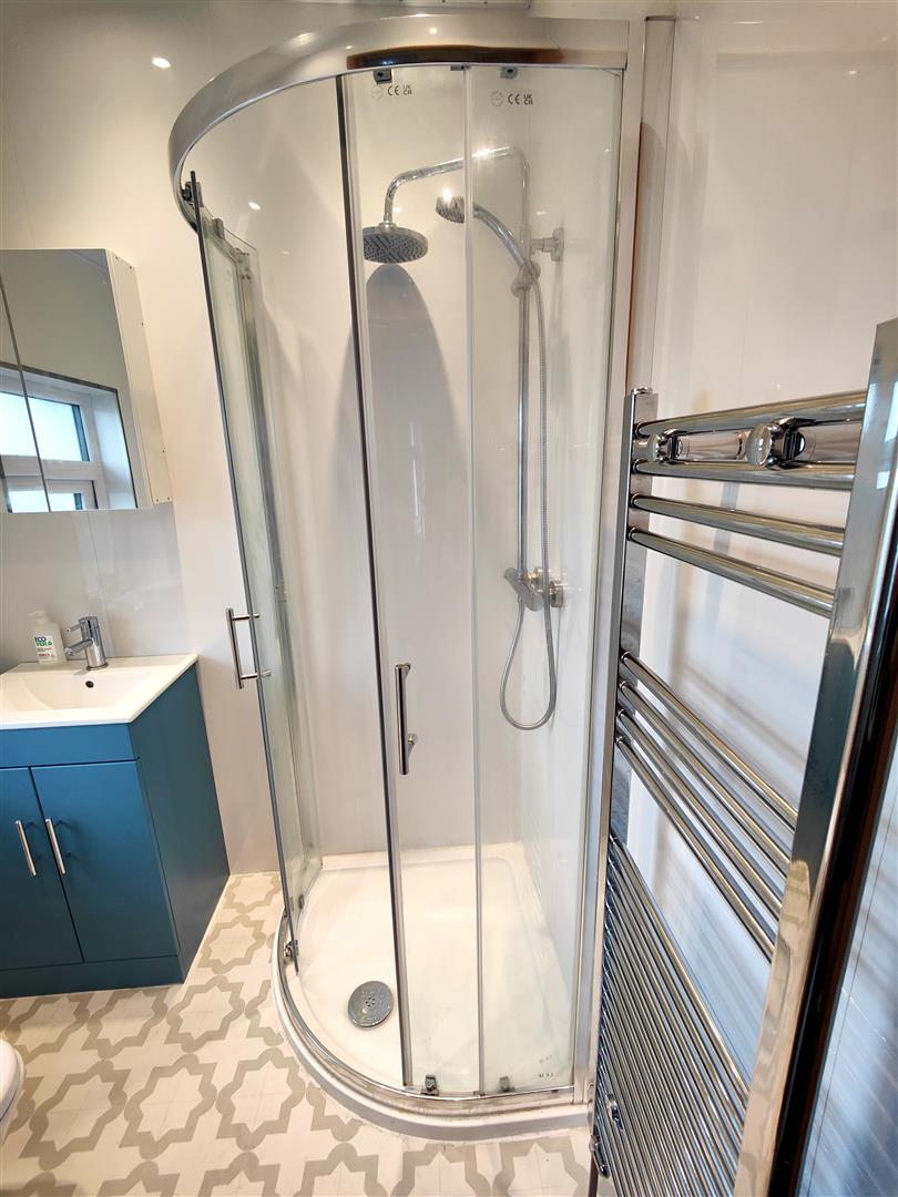 Modern white suite comprising shower cubicle, drench shower, telephone hand shower, vanity unit, low flush wc, pvc panelled walls and ceiling, recessed lighting, feature radiator.