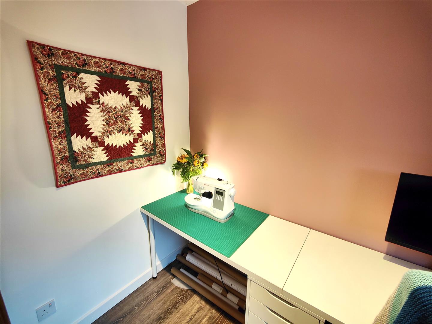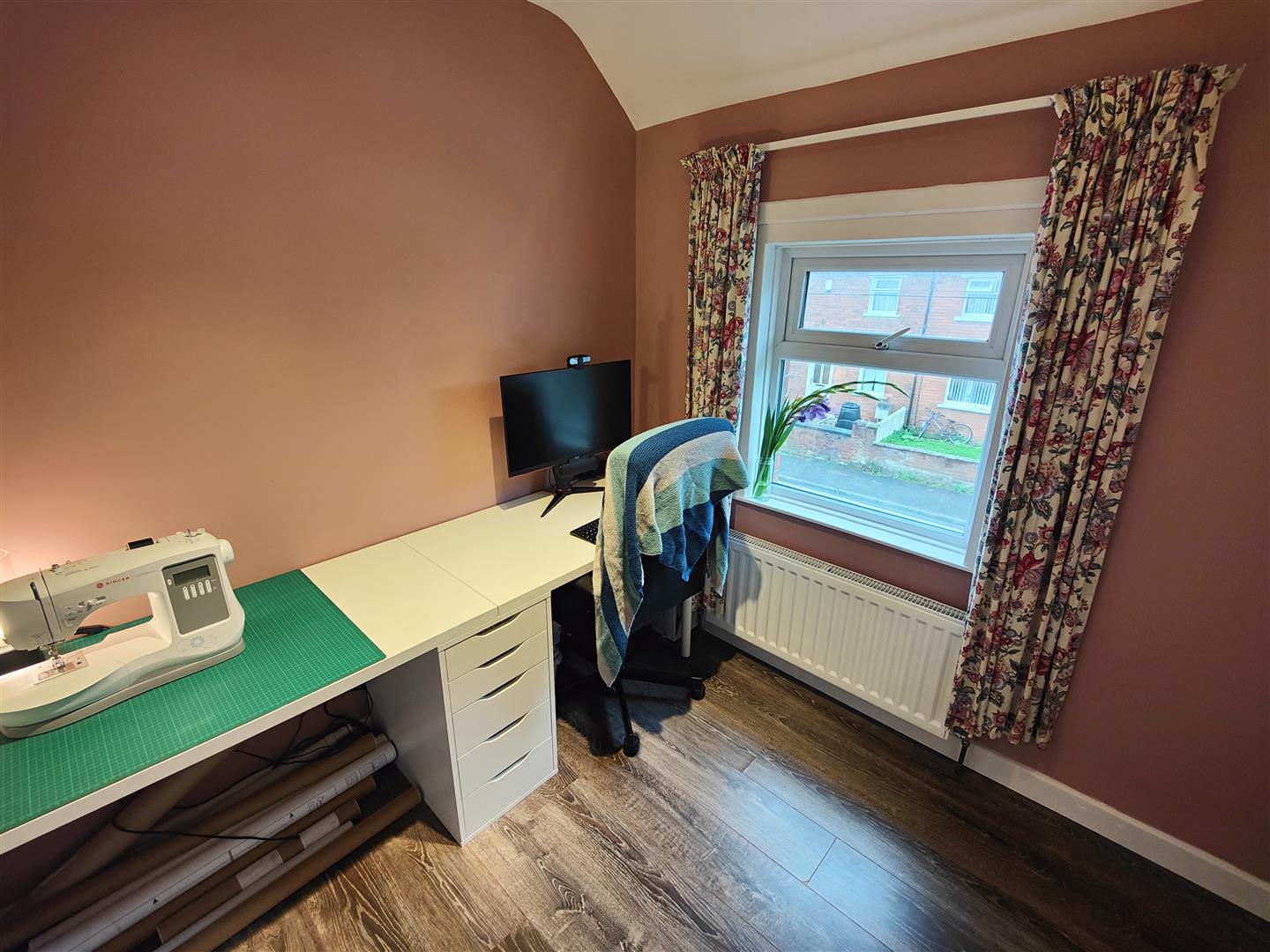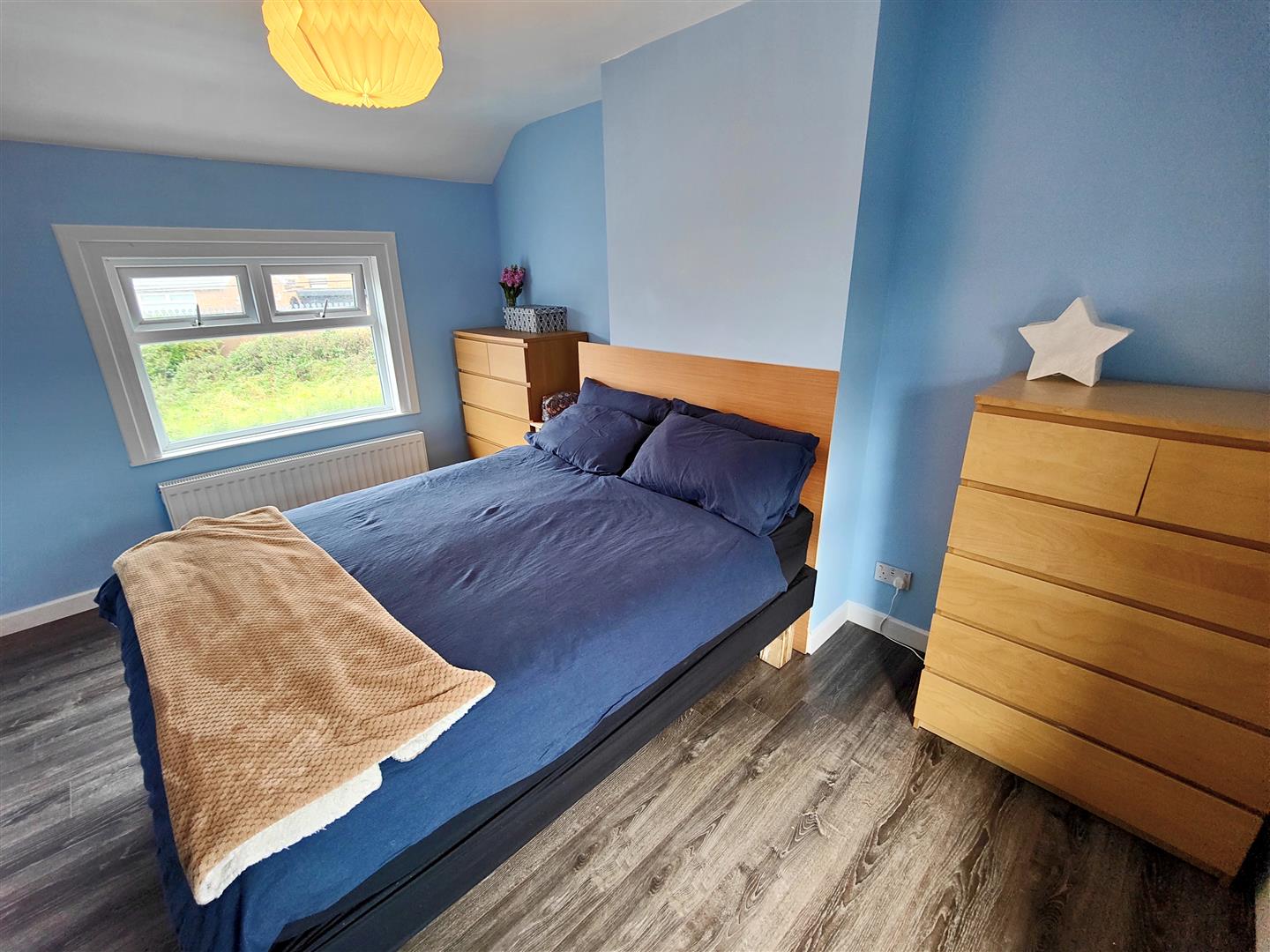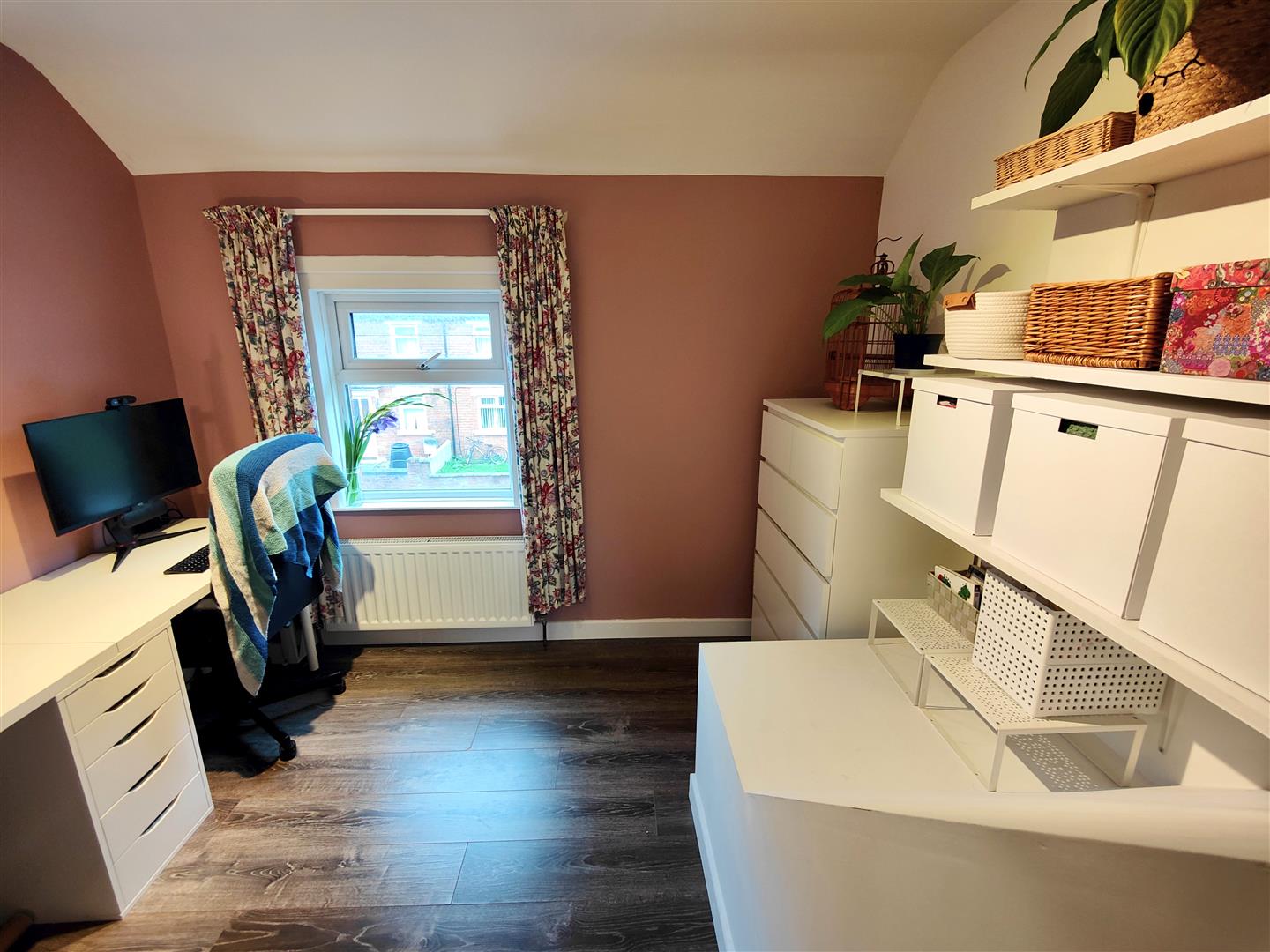 Wood laminate floor, panelled radiator.