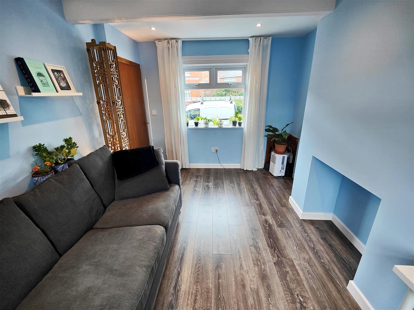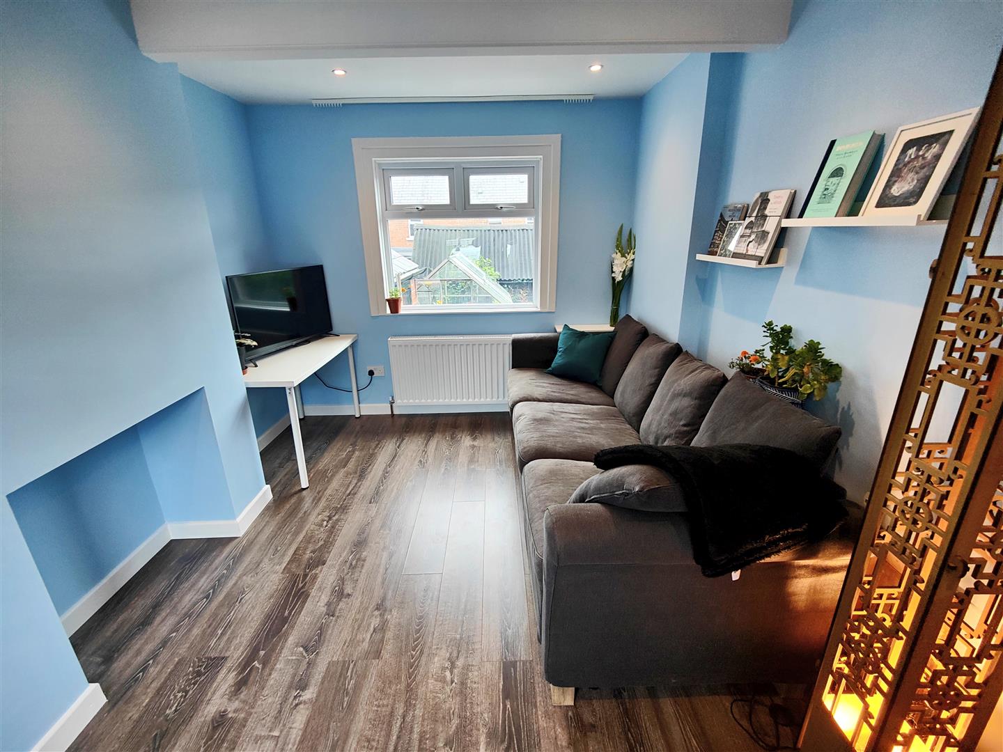 Hole in wall fireplace, wood laminate floor, double panelled radiator, recessed lighting.