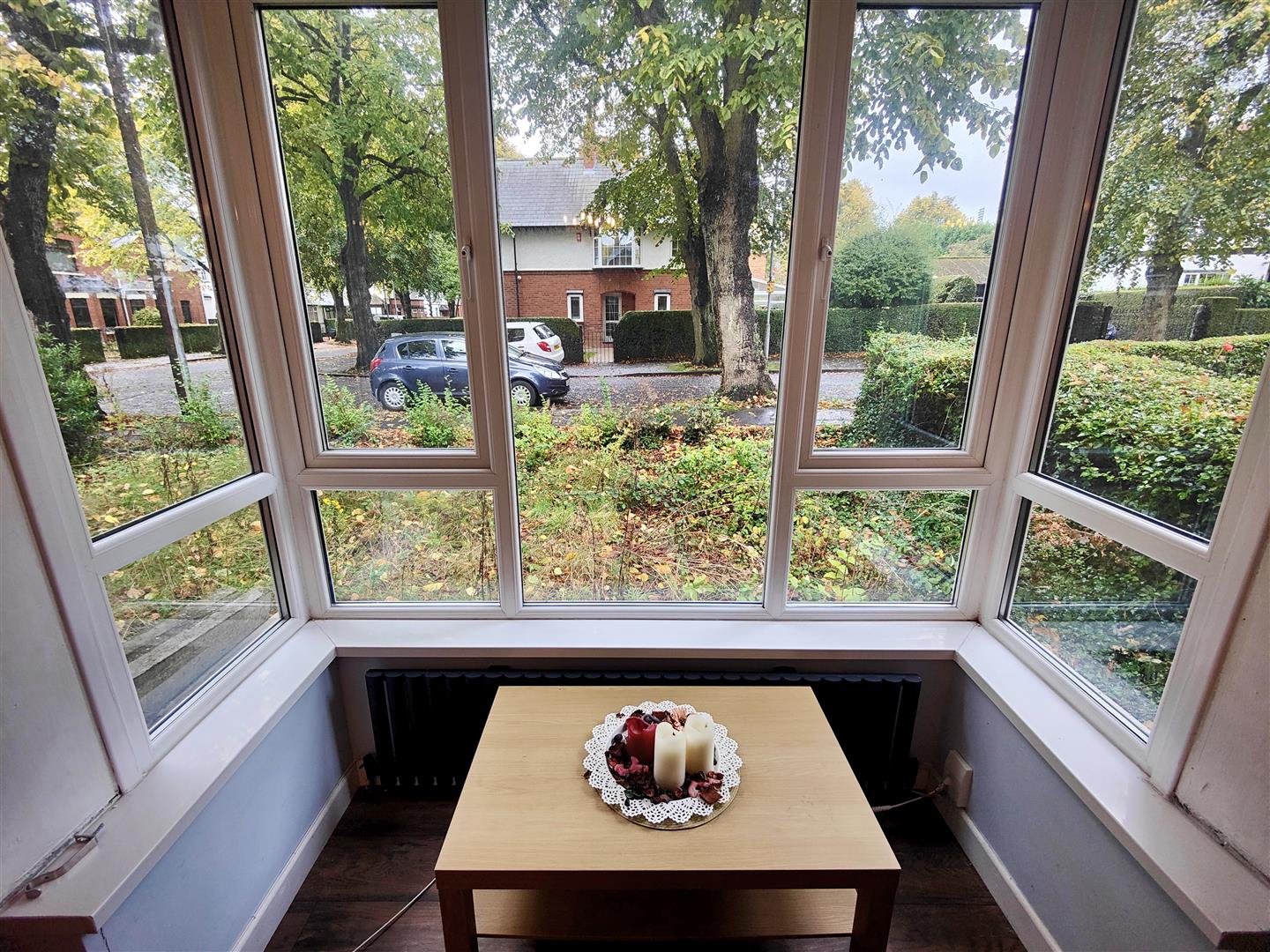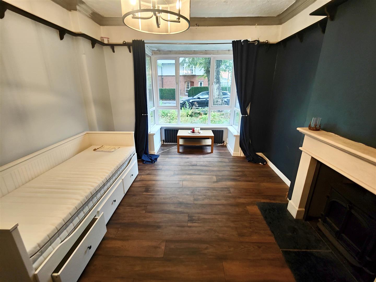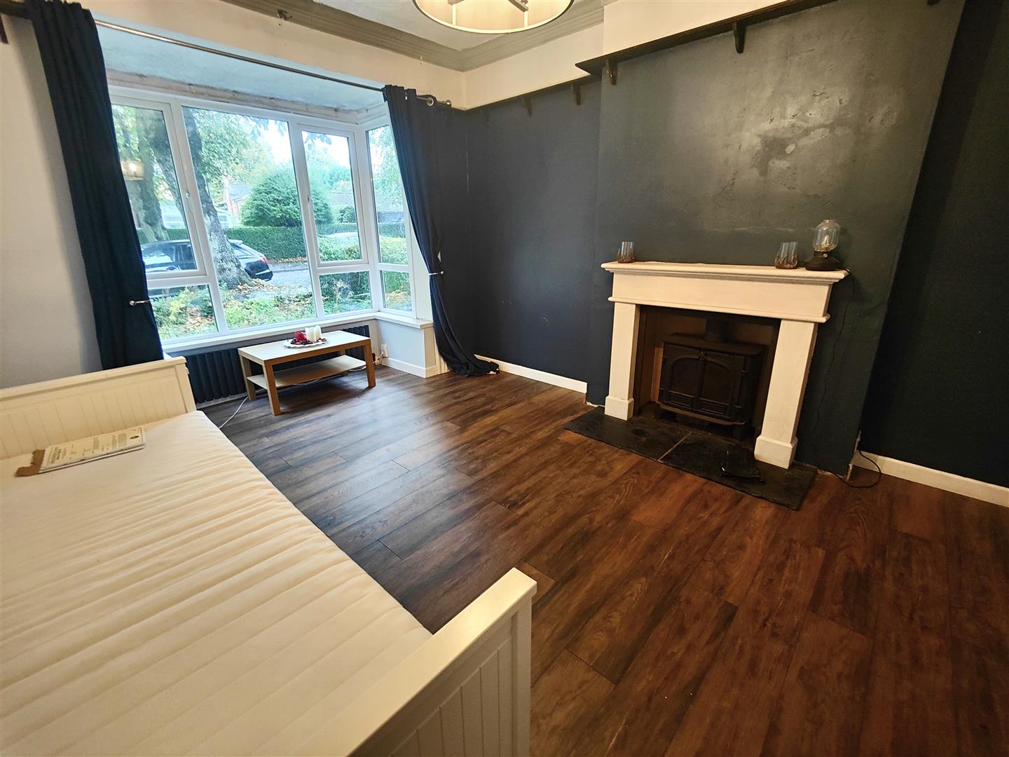 Attractive marble fireplace, wood burning stove, feature panelled radiator, cornice ceiling, wood laminate floor.