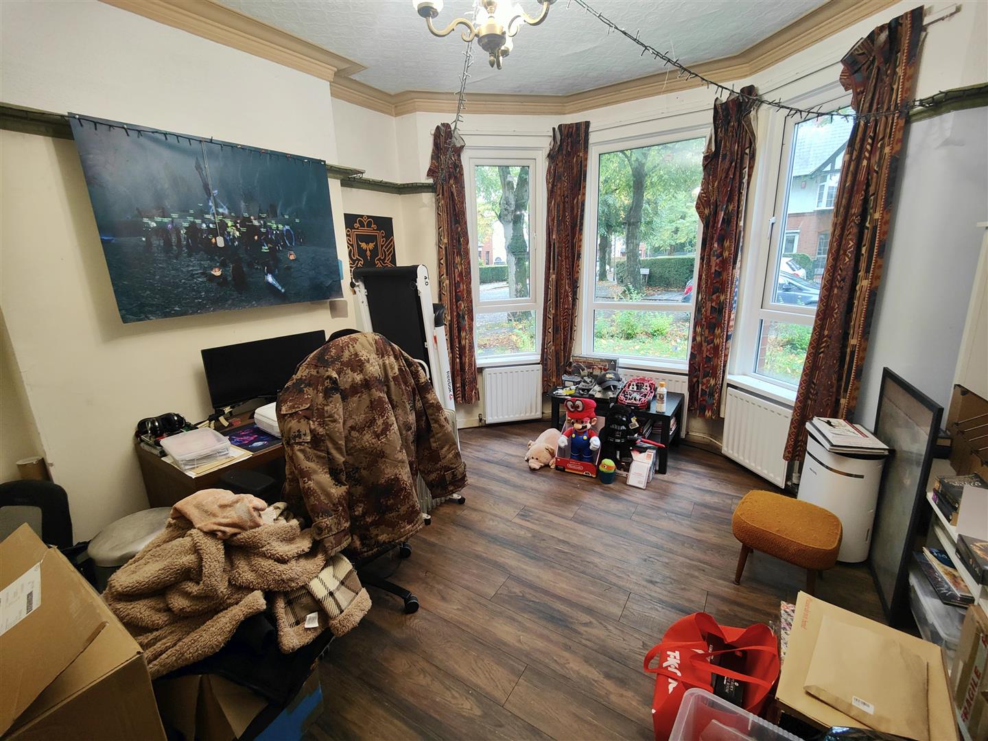 Wood laminate floor, three panelled radiators, cornice ceiling, ceiling rose.