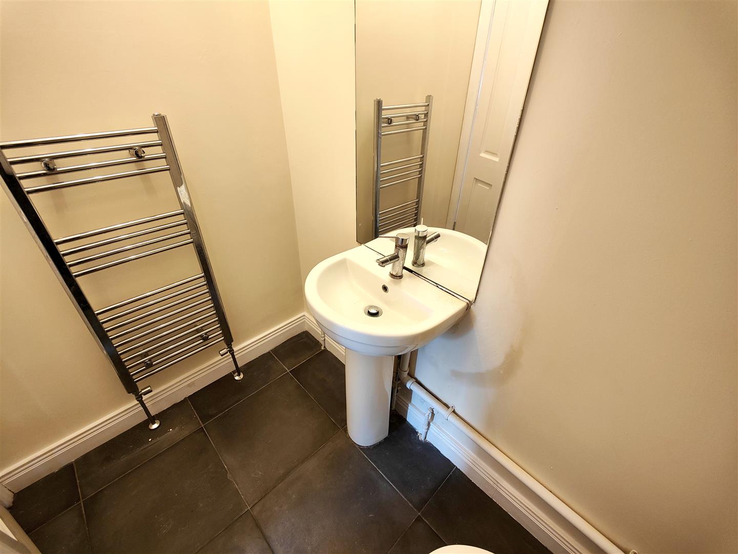 Modern white bathroom suite comprising low flush WC, pedestal wash hand basin, chrome radiator, ceramic tiled floor.
