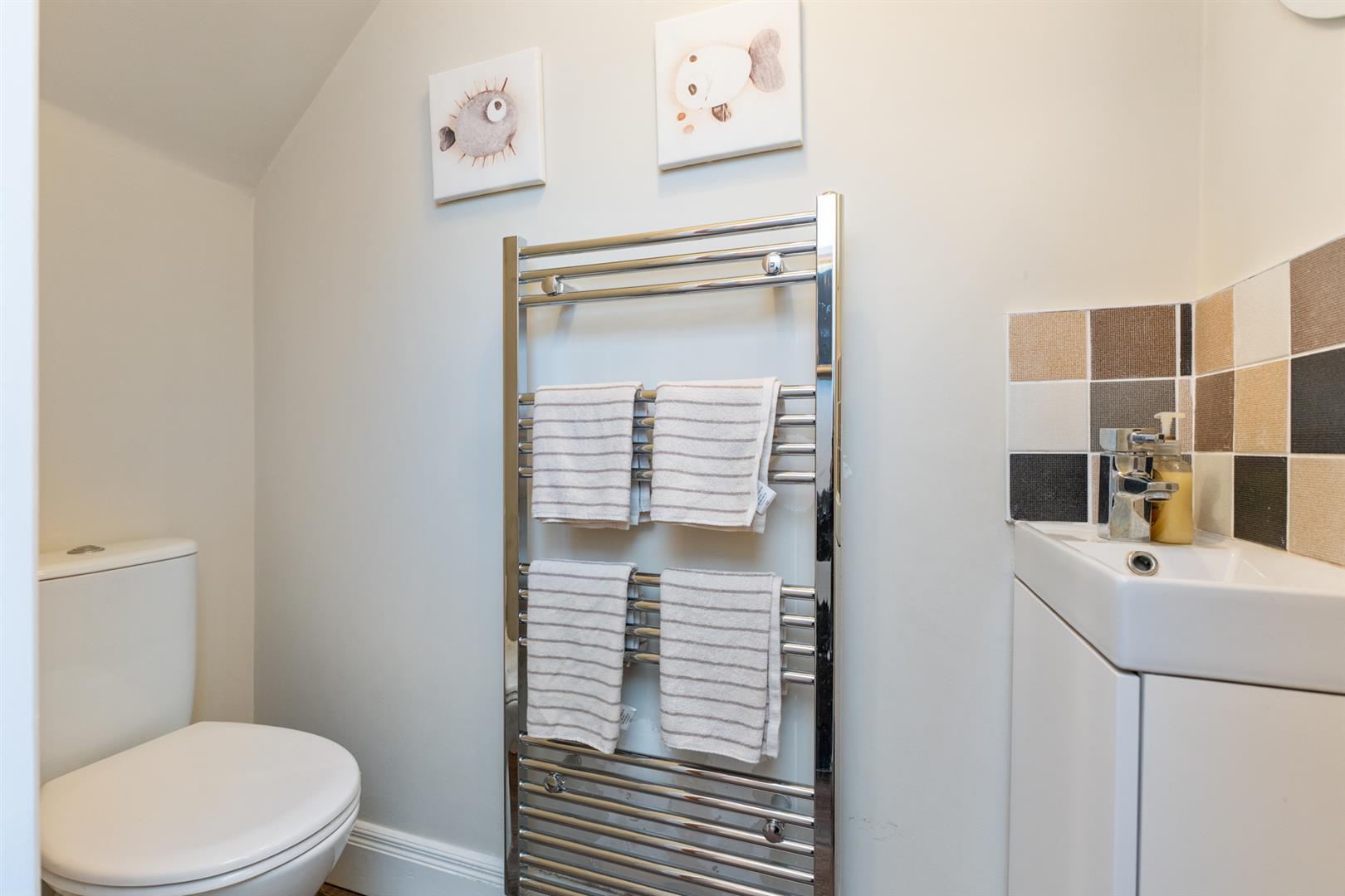 Furnished cloakroom - White suite comprising low flush wc, vanity unit, panelled radiator, partly tiled walls, wood laminate floor.