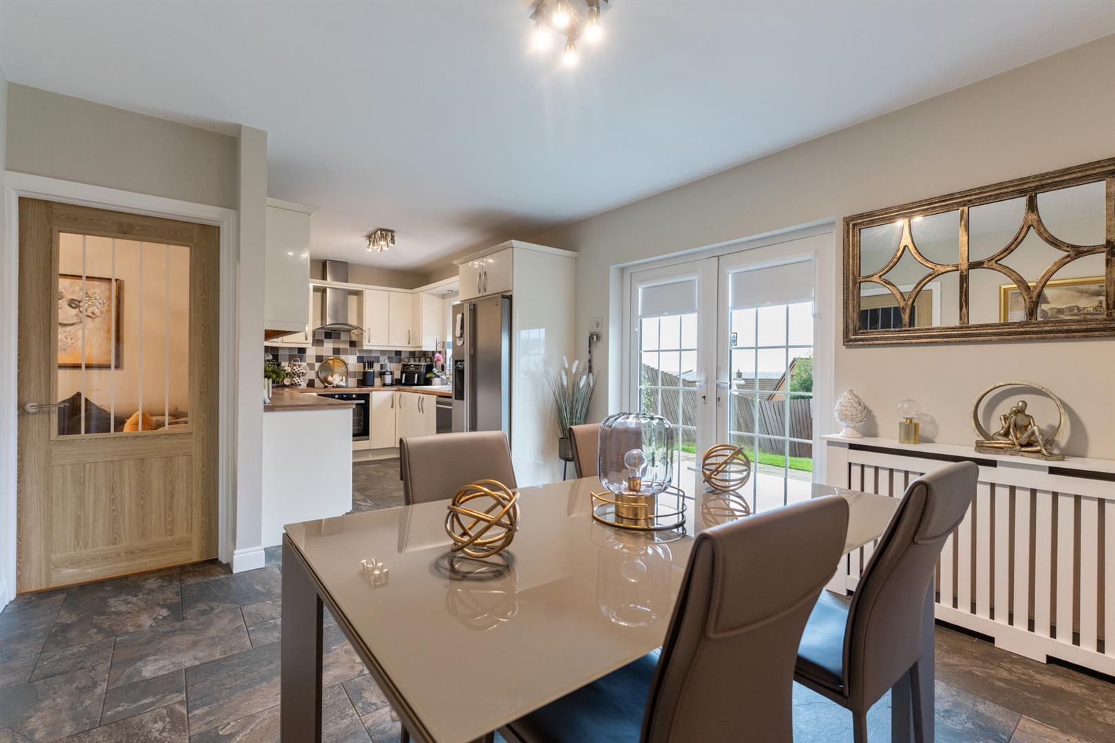 Double panelled radiator, upvc double glazed patio doors, ceramic tiled floor.
