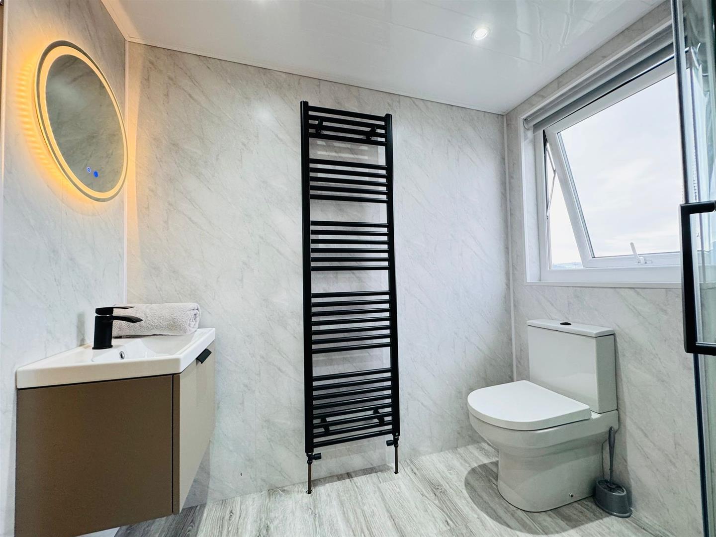 Chrome shower cubicle, thermostatic shower, twin floating vanity units, low flush wc, heated towel radiator, pvc panelled walls