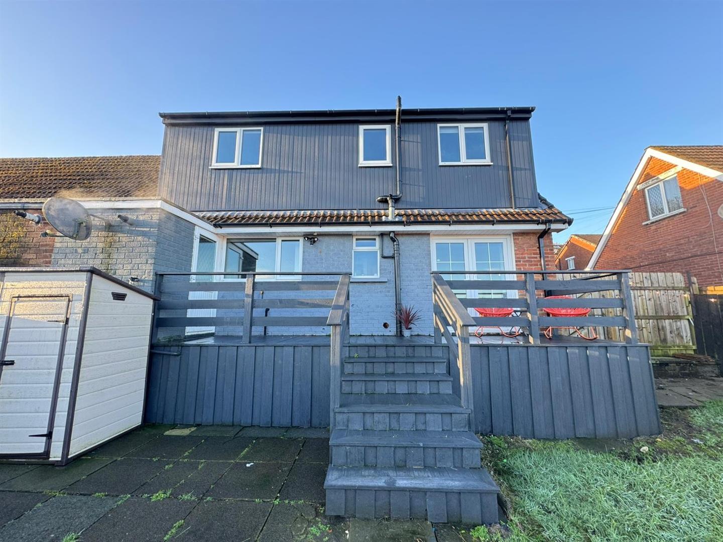 Garden to rear in awn with pebbled patio area, feature raised decking area