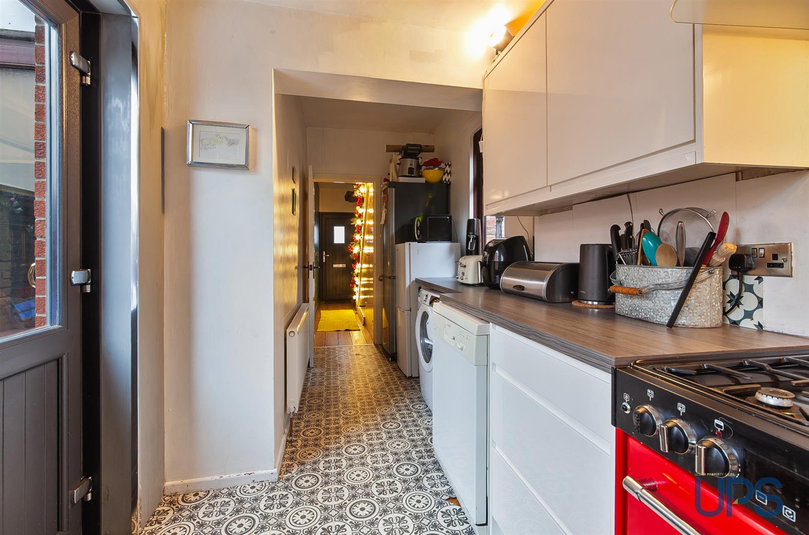 Bowl and a half stainless steel sink unit, extensive range of high and low level units, formica worktops, cooker space, stainless steel canopy extractor fan, panelled radiator, plumbed for washing machine, fridge freezer space, partially tiled walls, uPvc double glazed door to rear.