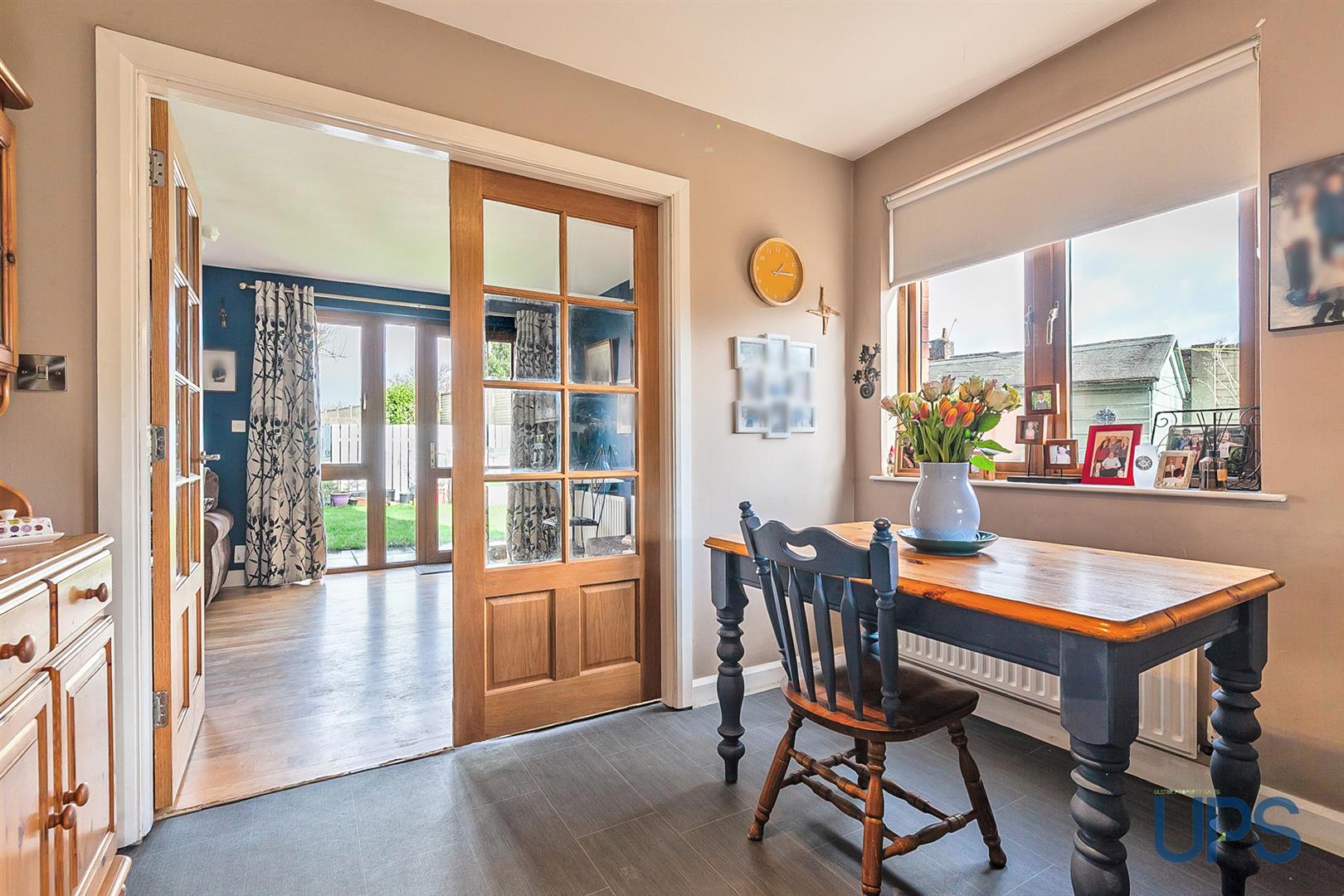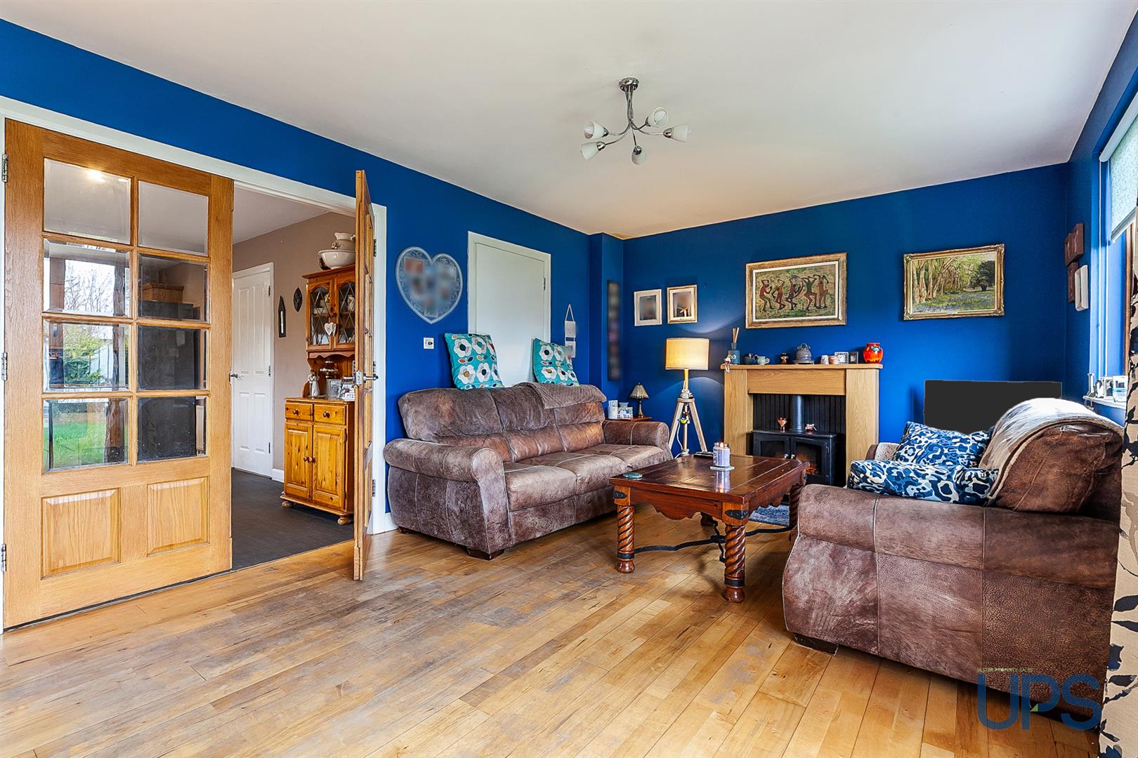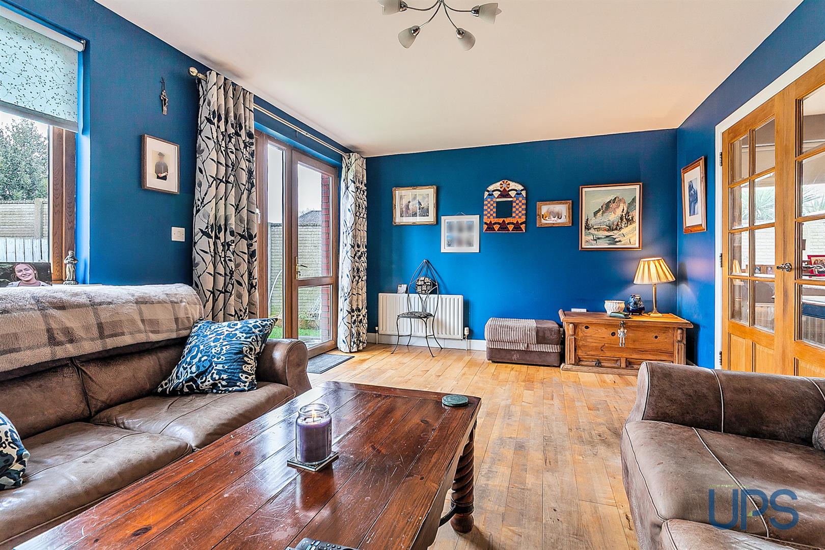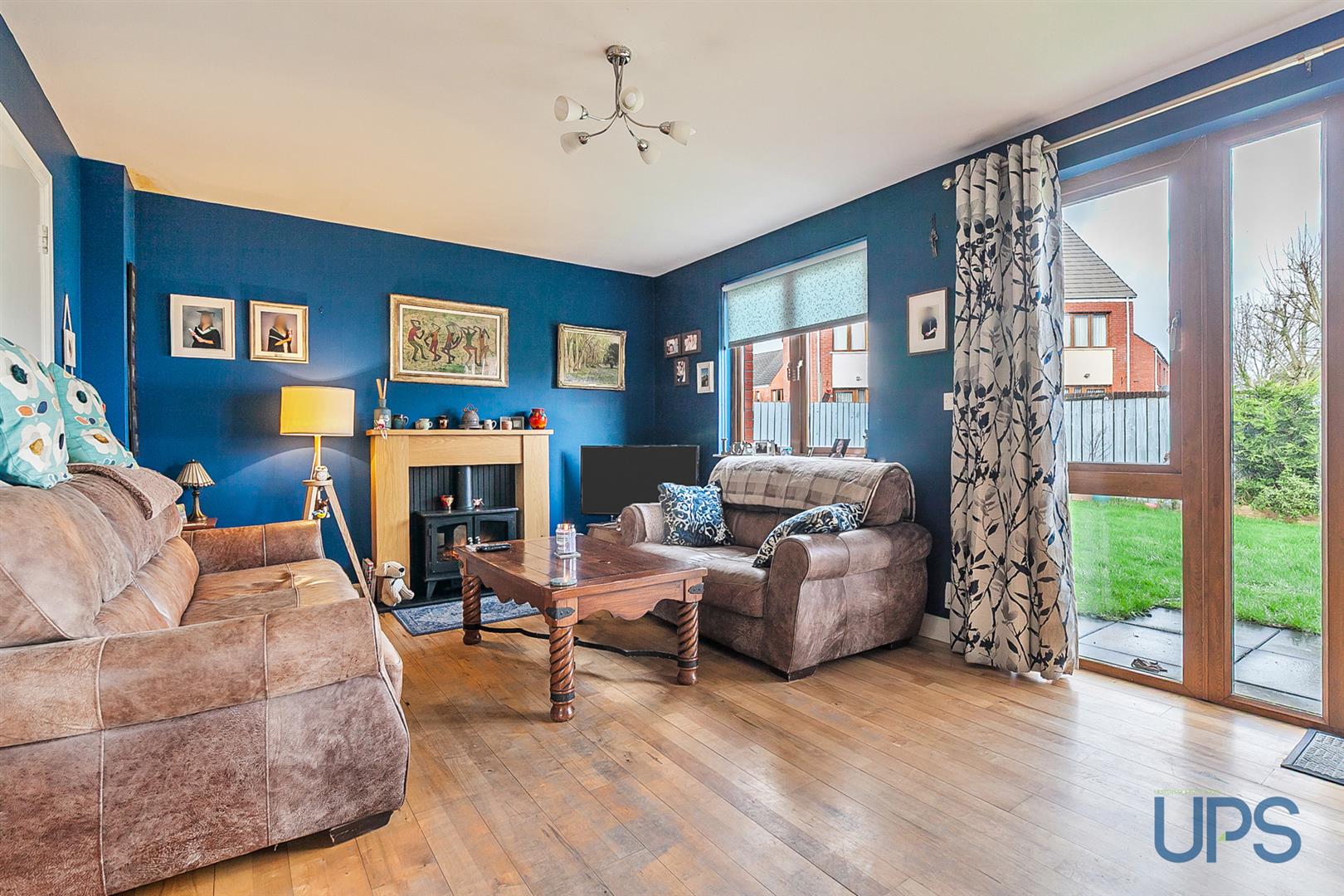 Real effect electric fire, wooden floor, panelled radiator, uPvc double glazed patio doors.