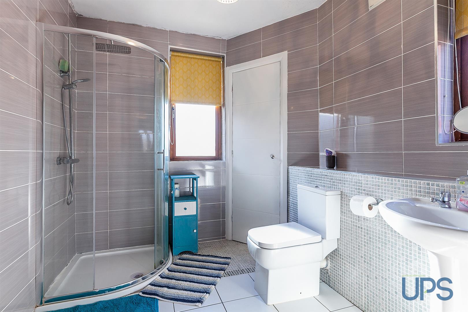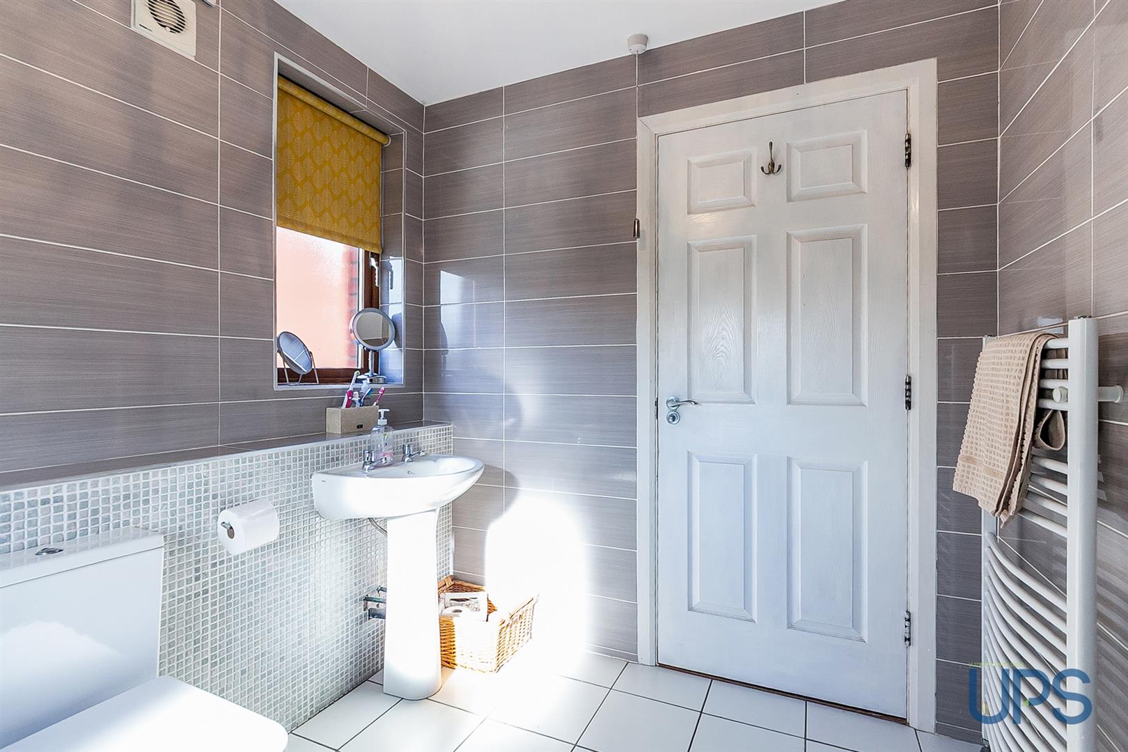 White suite comprising shower cubicle, thermostatically controlled drench style shower unit, telephone handset shower unit, vanity unit, built-in storage, low flush wc, panelled radiator, partly mosaic tiled walls, pvc panelled walls, extractor fan, feature radiator, ceramic tiled floor.