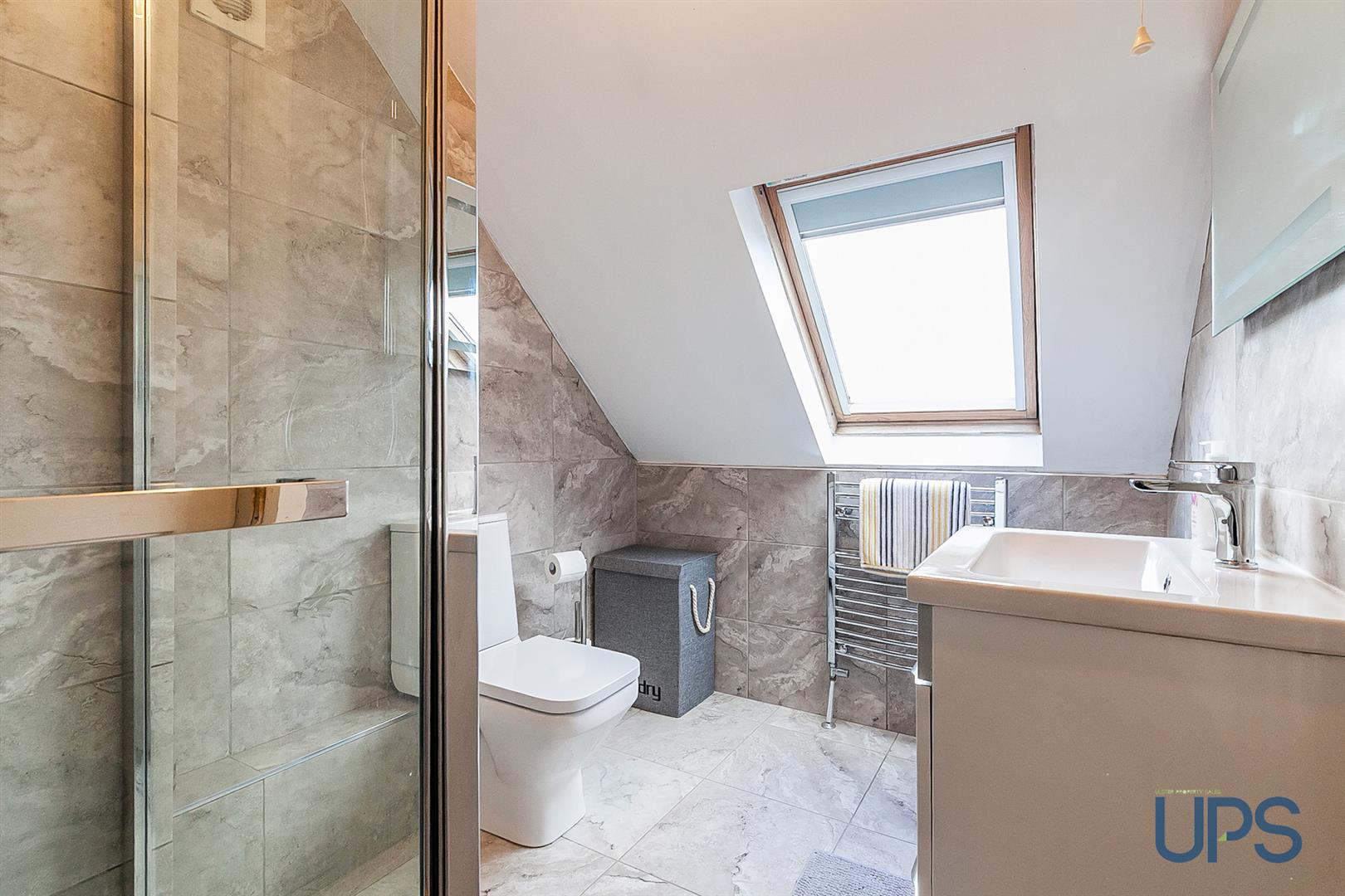 White suite comprising shower cubicle, pedestal wash hand basin, low flush wc, velux rooflight, partly tiled walls.