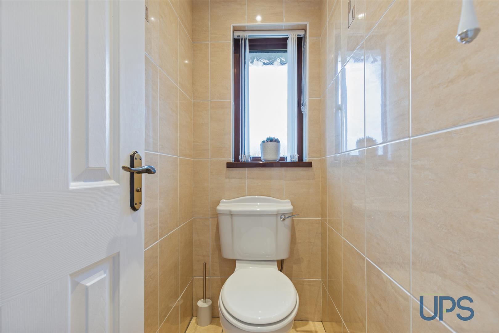 Low flush wc, fully tiled walls, ceramic tiled floor, pvc ceiling, recessed lighting.