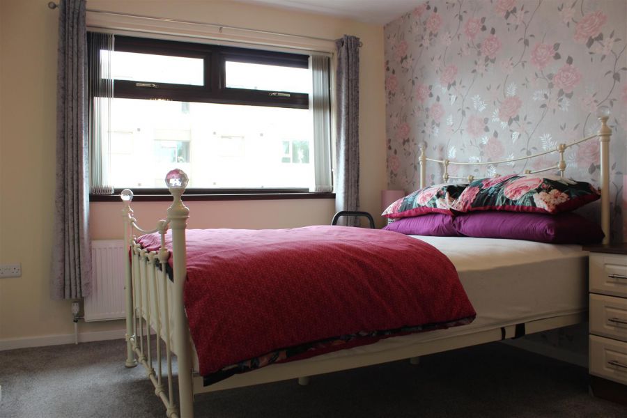 A large double bedroom tastefully decorated with built in storage cupboard, carpet, skirting boards and a large picture window.