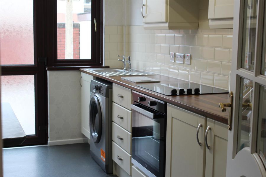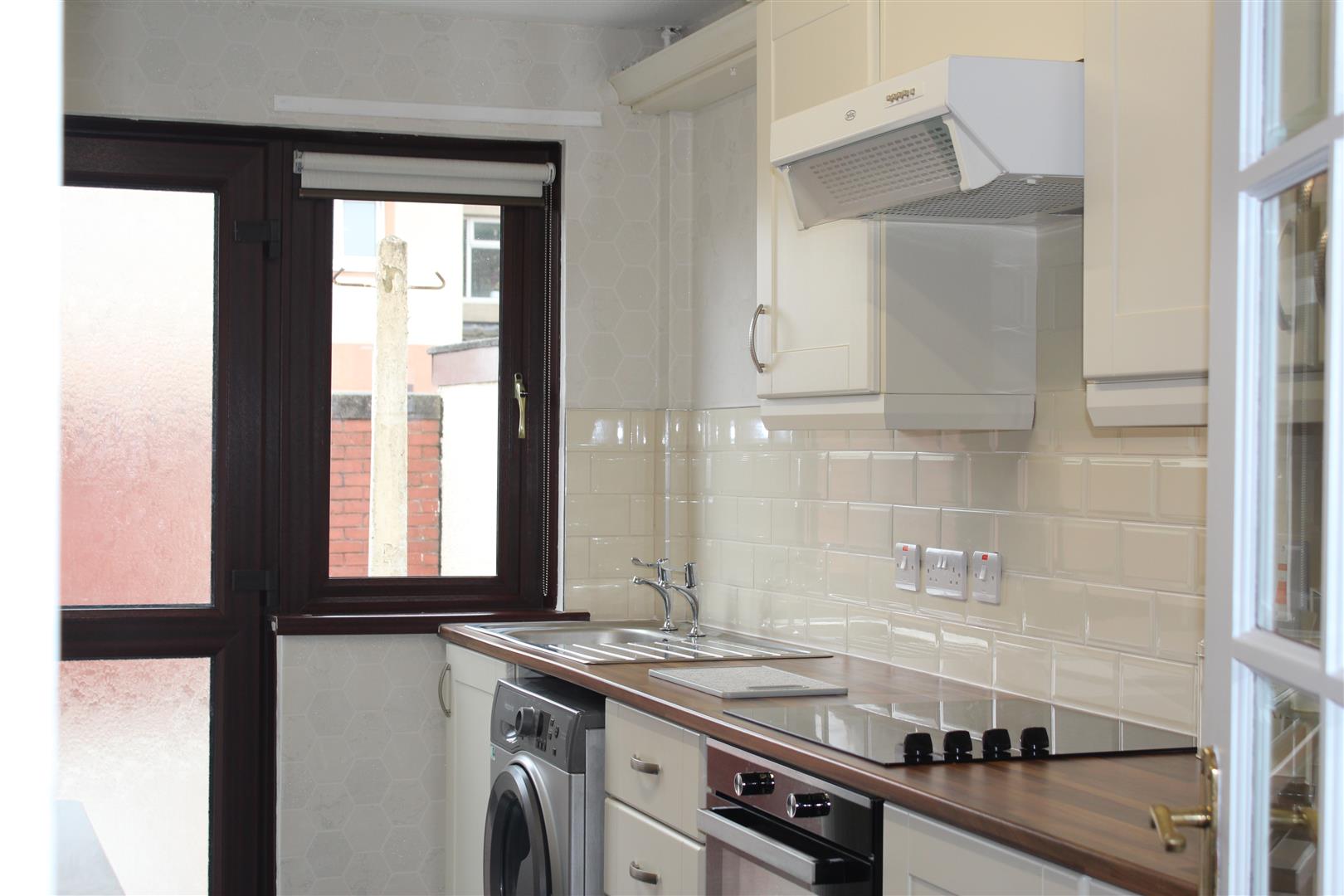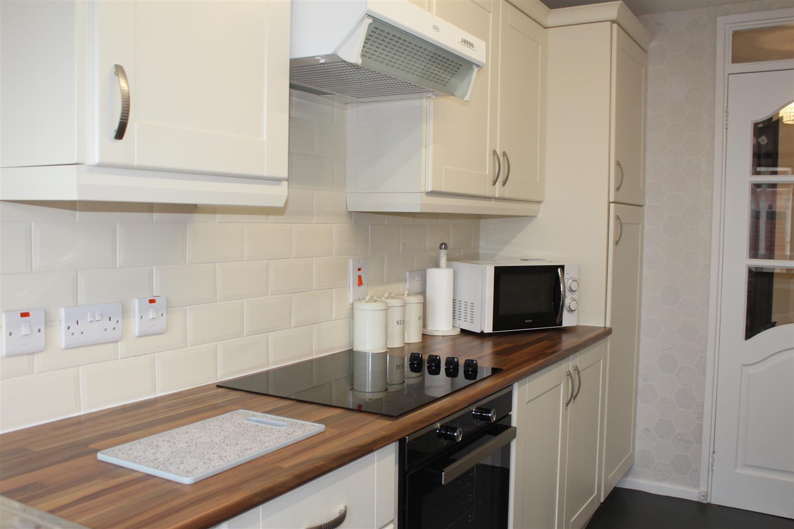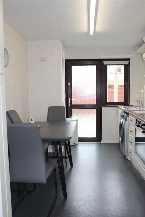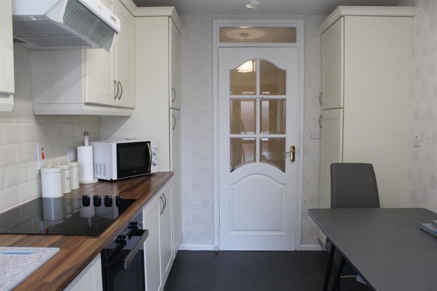 A recently renovated kitchen dining area with ample storage, integrated appliances including electric hob, and oven, and fridge/freezer along with a large utility cupboard housing the gas combi boiler. There is a back door with access onto a large paved patio area with shed.