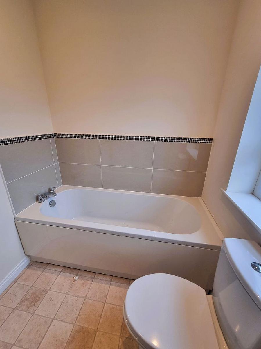 White suite comprising low flush WC, pedestal wash hand basin and panel bath with mixer tap, recessed lighting, part tiled walls, radiator.