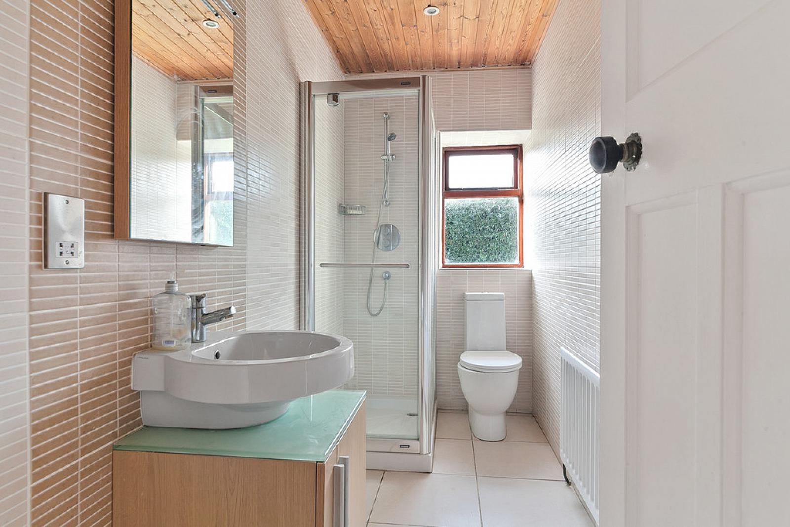 DOWNSTAIRS SHOWER ROOM Enclosed shower cubicle, low flush WC, feature vanity wash hand basin, tiled walls, tiled floor, timber tongue and groove panelled ceiling.